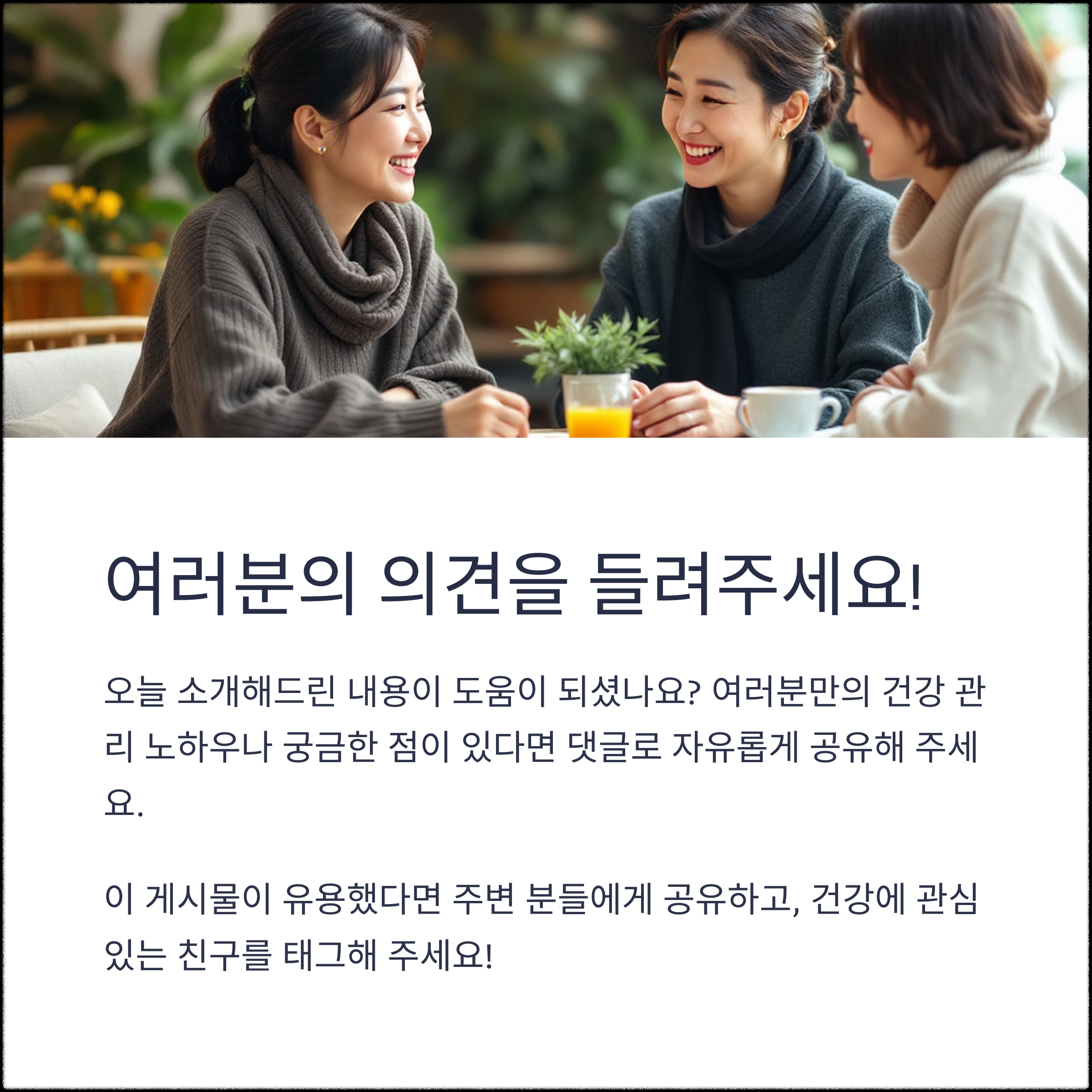 오늘 소개해드린 내용이 도움이 되셨나요? 여러분만의 건강 관리 노하우나 궁금한 점이 있다면 댓글로 자유롭게 공유해 주세요. 여러분의 소중한 의견이 많은 분들께 큰 도움이 됩니다!