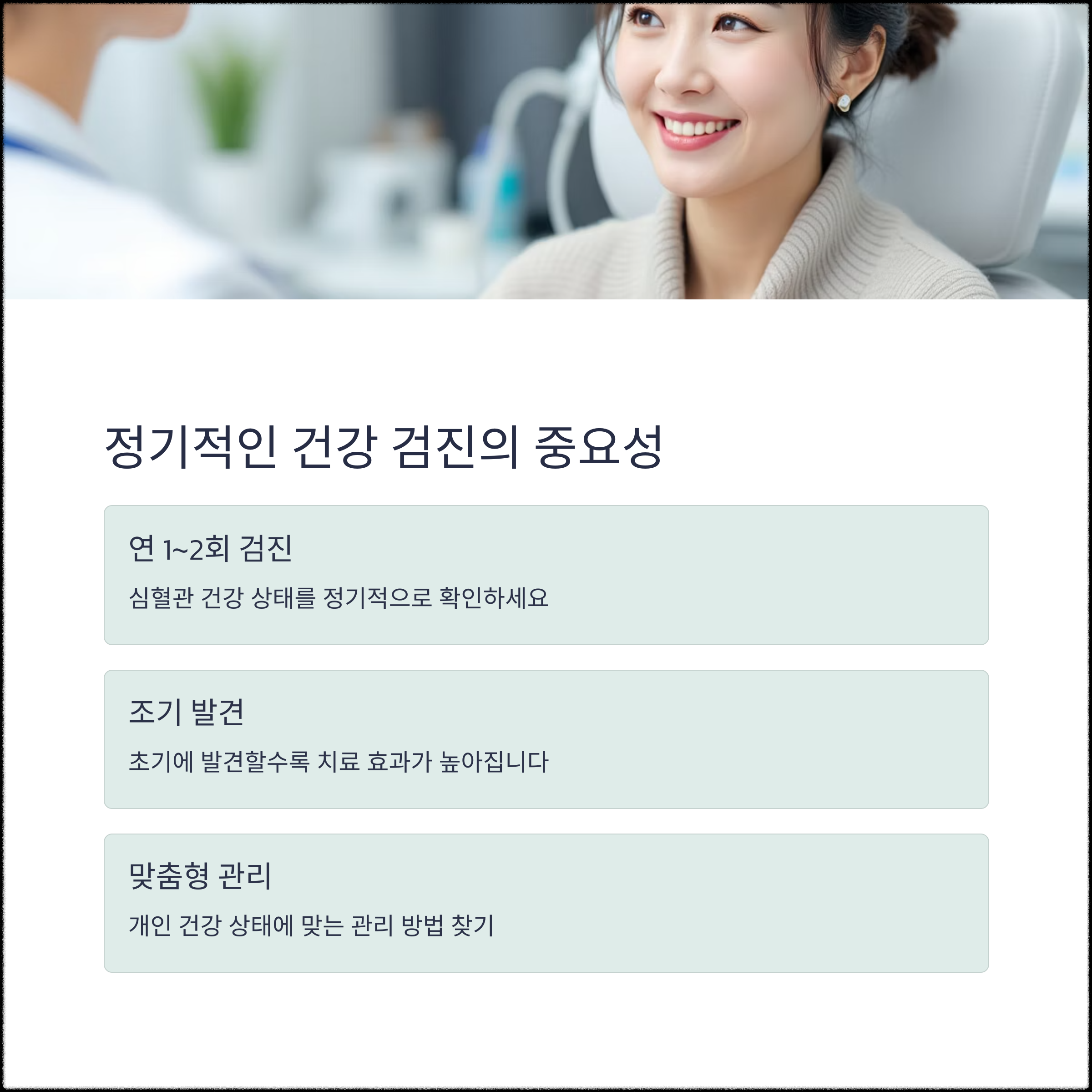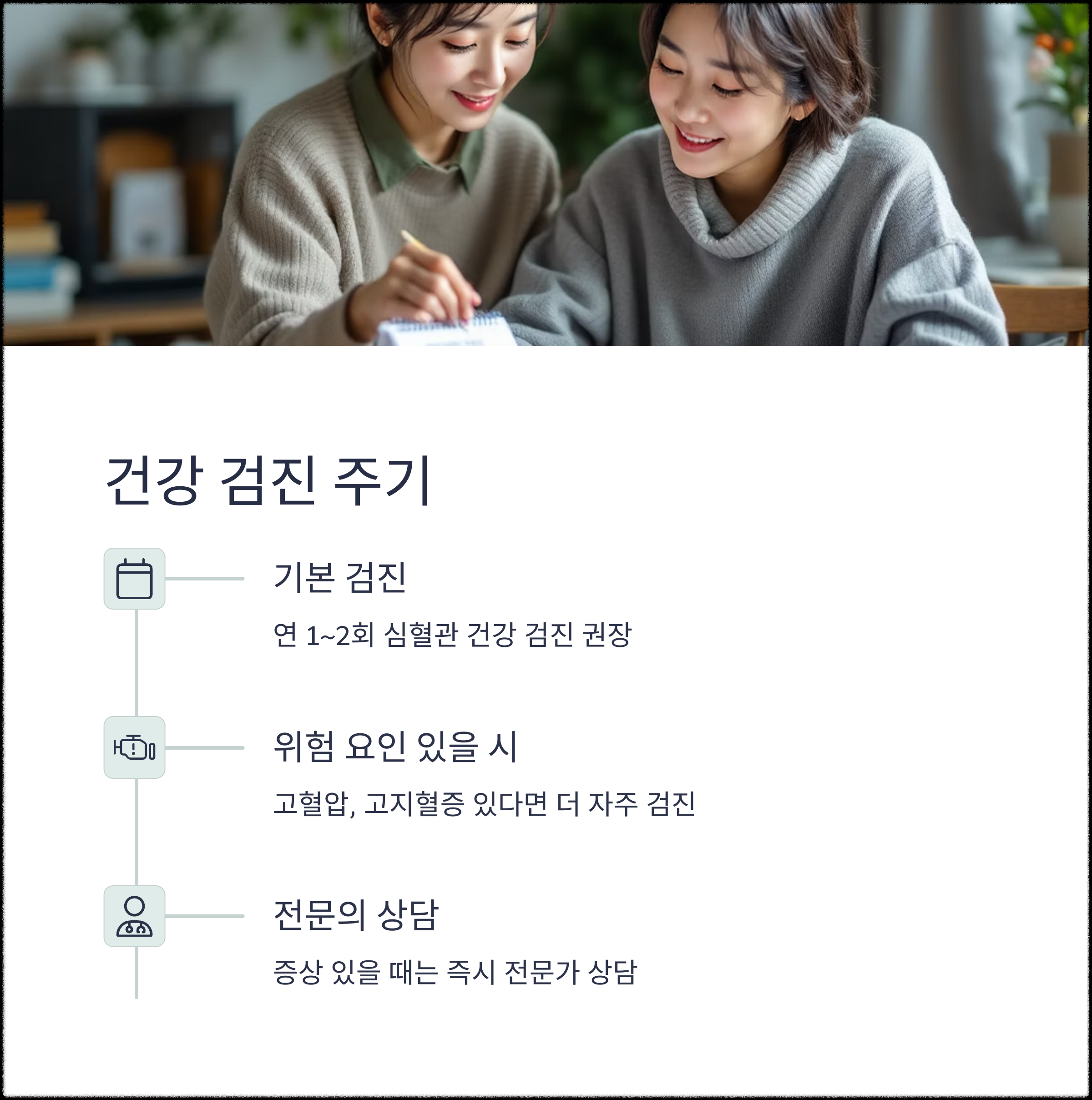 정기적인 건강 검진 또한 중요한 예방법 중 하나입니다. 특히 중년 여성은 연 1~2회 심혈관 검진을 통해 자신의 건강 상태를 파악하는 것이 필요합니다. 조기 발견 시 치료 효과가 높아지며, 예방 차원에서도 매우 유익합니다. 지금부터라도 자신의 건강을 위한 작은 실천을 시작해보세요.