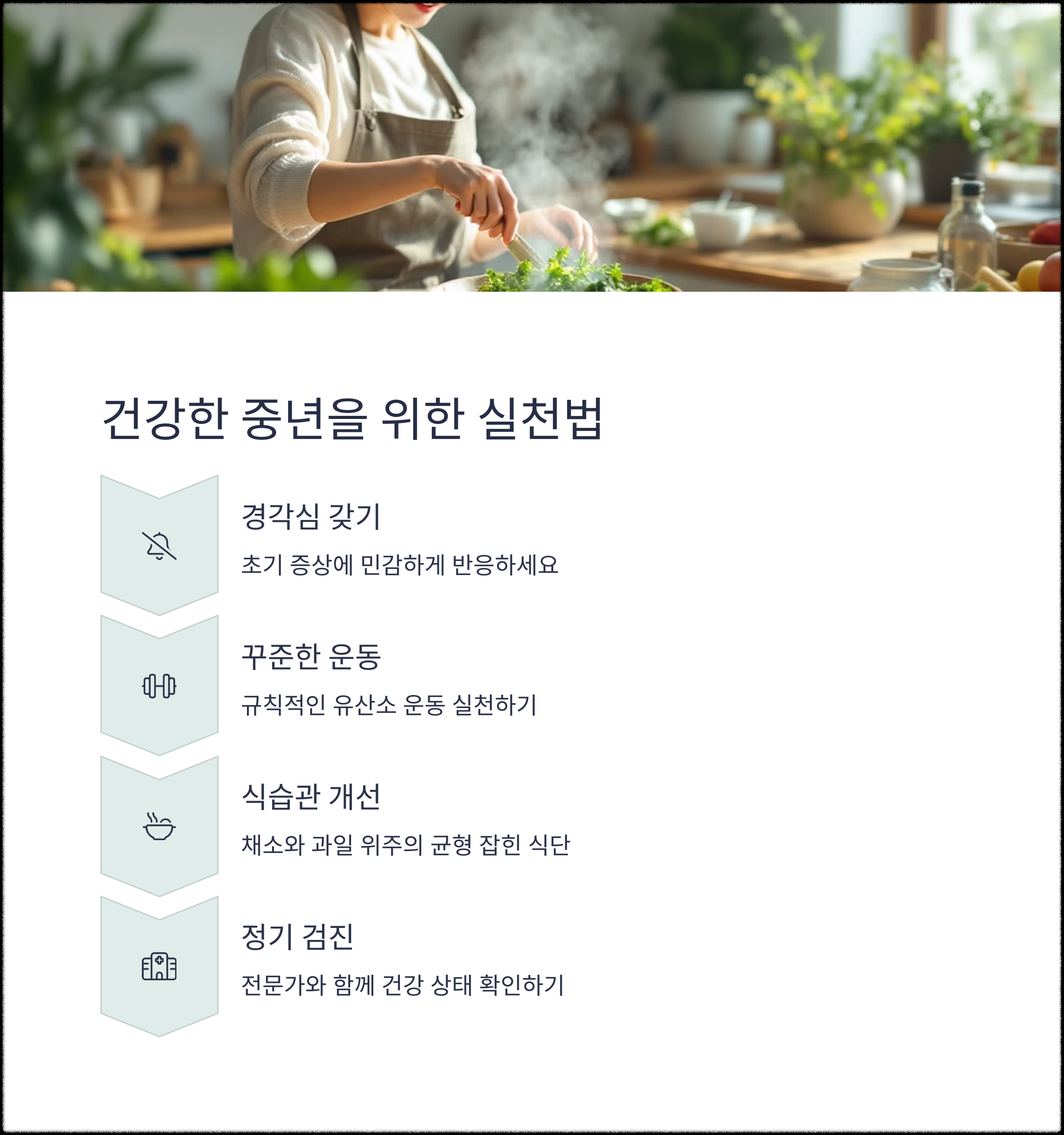 중년 여성에게 심혈관 질환은 조기에 관리하면 충분히 예방 가능하고 건강한 삶을 유지할 수 있습니다. 초기 증상에 대한 경각심을 갖고, 평소 운동, 식습관 개선, 스트레스 관리를 꾸준히 실천하는 것이 중요합니다. 또한, 정기적인 건강 검진을 통해 자신의 상태를 정확히 파악하고 필요시 전문가의 도움을 받으세요. 오늘부터라도 작은 변화로 건강한 미래를 준비해 보시기 바랍니다.