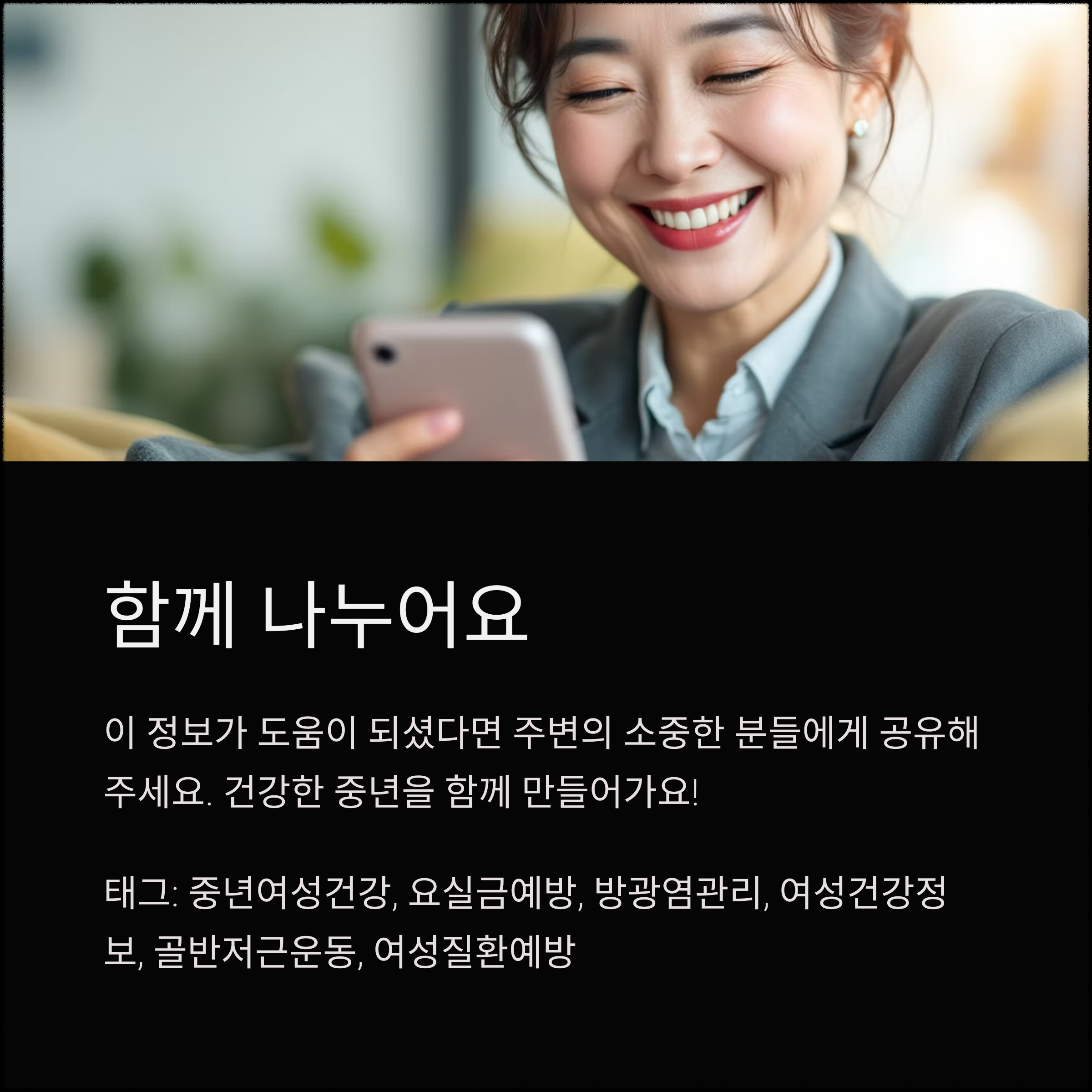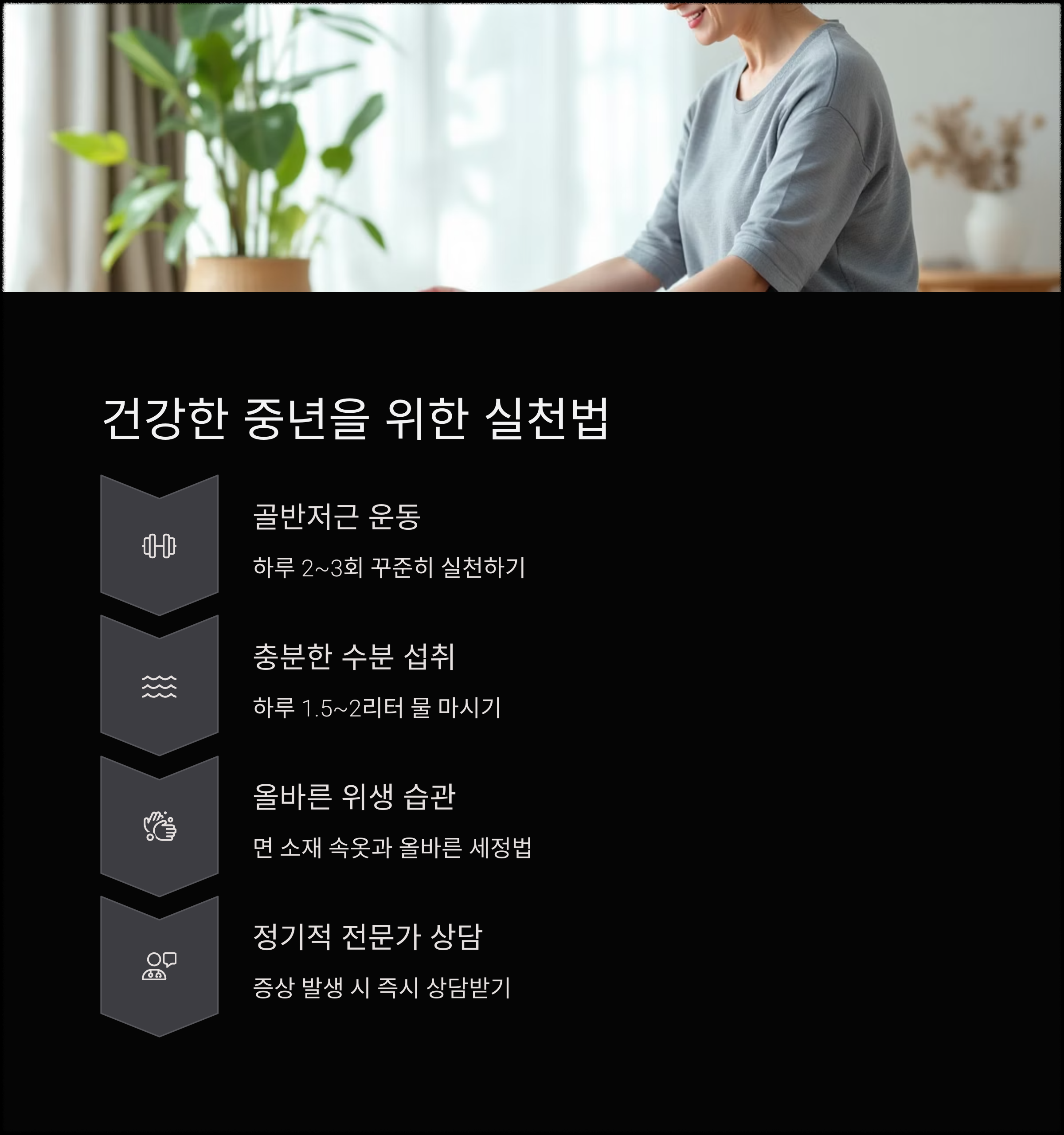 중년 여성의 요실금과 방광염은 조기에 관리하고 예방하는 것이 가장 중요합니다. 평소 골반저근 운동, 충분한 수분 섭취, 올바른 위생 습관을 실천하면 건강한 생활을 유지할 수 있습니다. 또한 정기적인 전문가 상담과 검진을 통해 증상의 원인을 정확히 파악하고 필요한 치료를 받는 것이 좋습니다. 작은 실천이 건강하고 활기찬 중년을 만드는 시작입니다. 오늘부터 바로 실천해보세요!