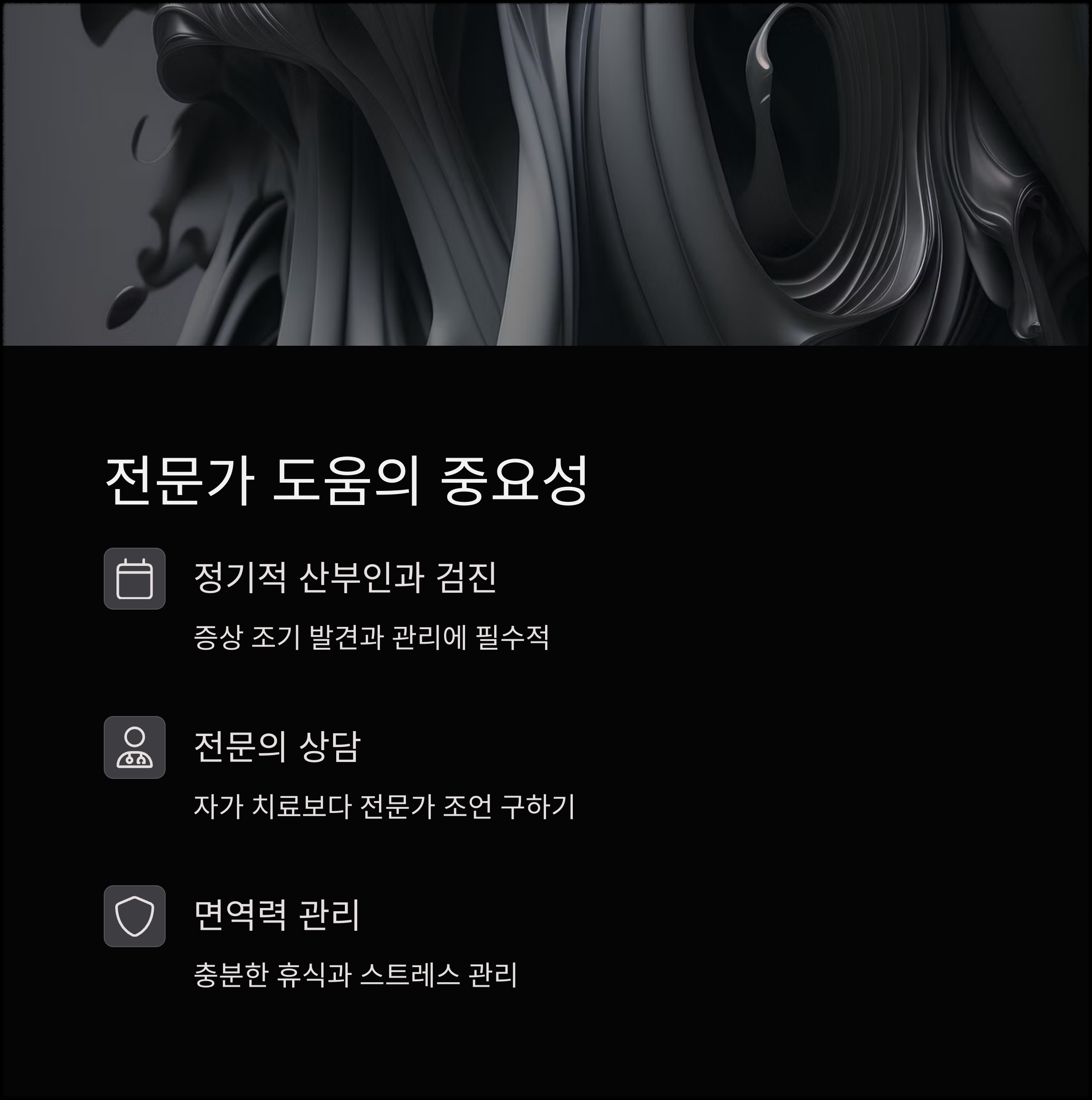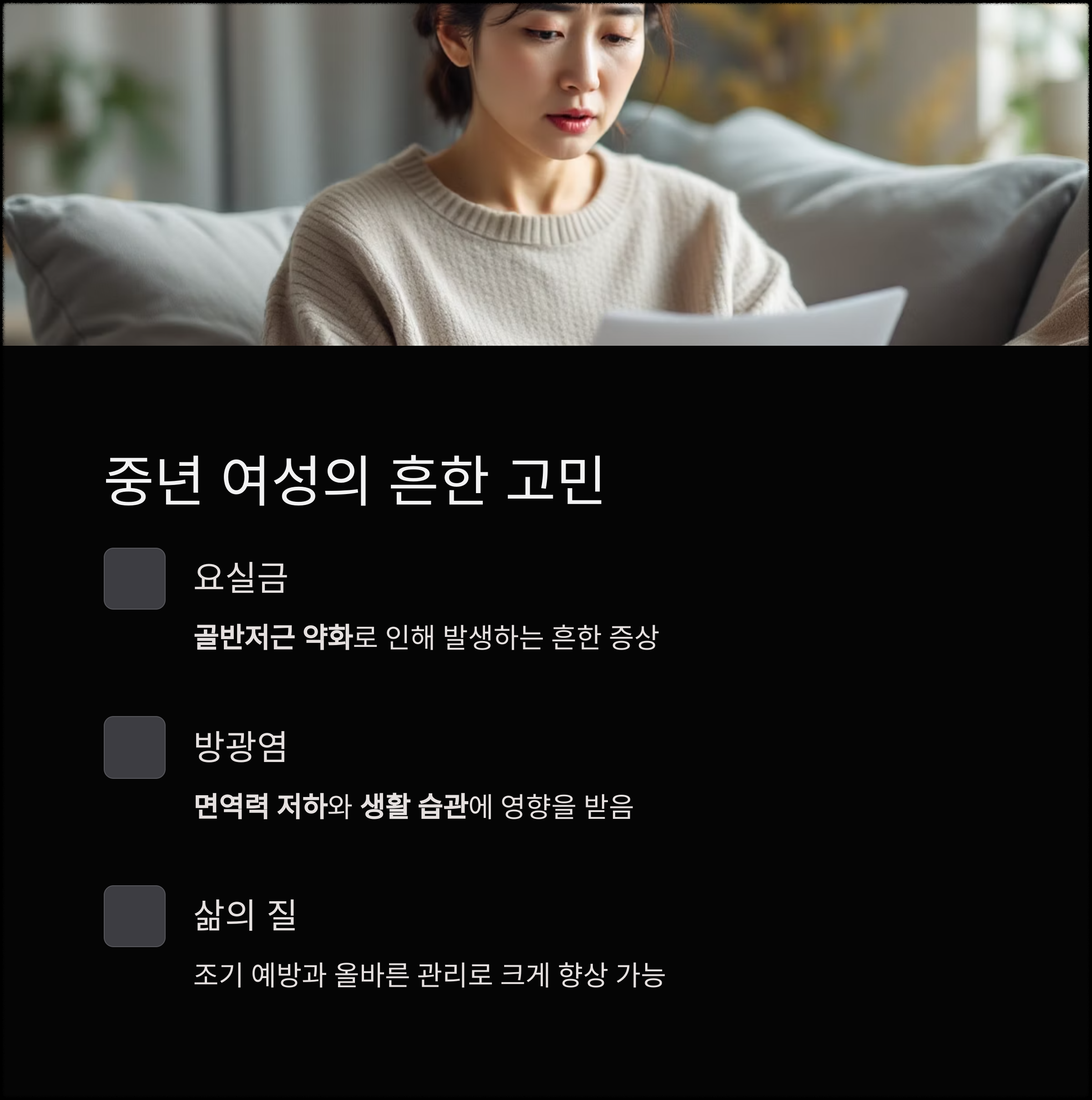 정기적인 산부인과 검진과 전문의 상담도 요실금과 방광염 관리에 큰 도움이 됩니다. 증상이 나타날 경우 자가 치료보다는 전문가와 상의하여 적절한 치료를 받는 것이 중요합니다. 또한 충분한 휴식과 스트레스 관리로 면역력을 높이는 것도 예방에 효과적입니다. 꾸준한 관리로 건강하고 자신감 있는 중년을 보내세요.