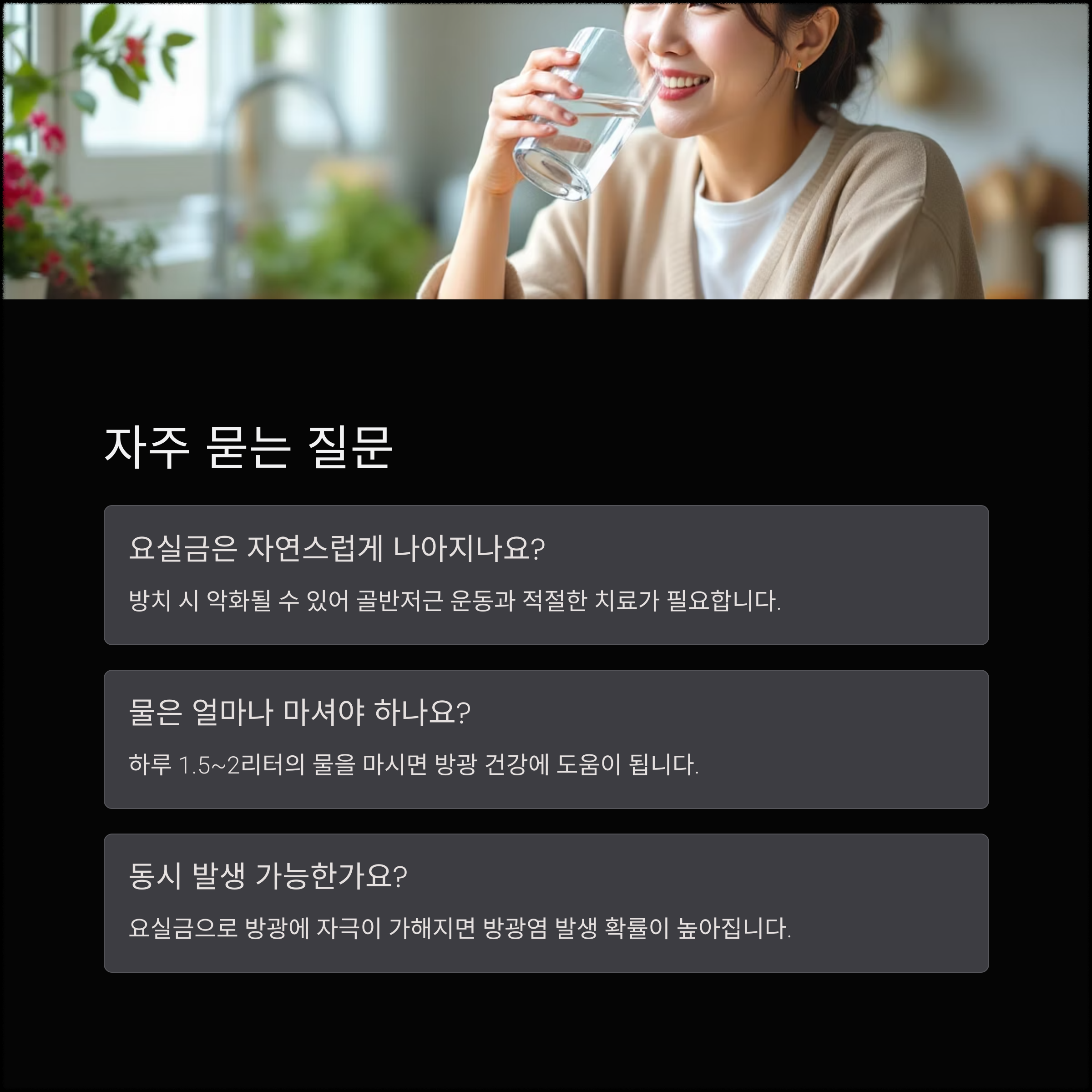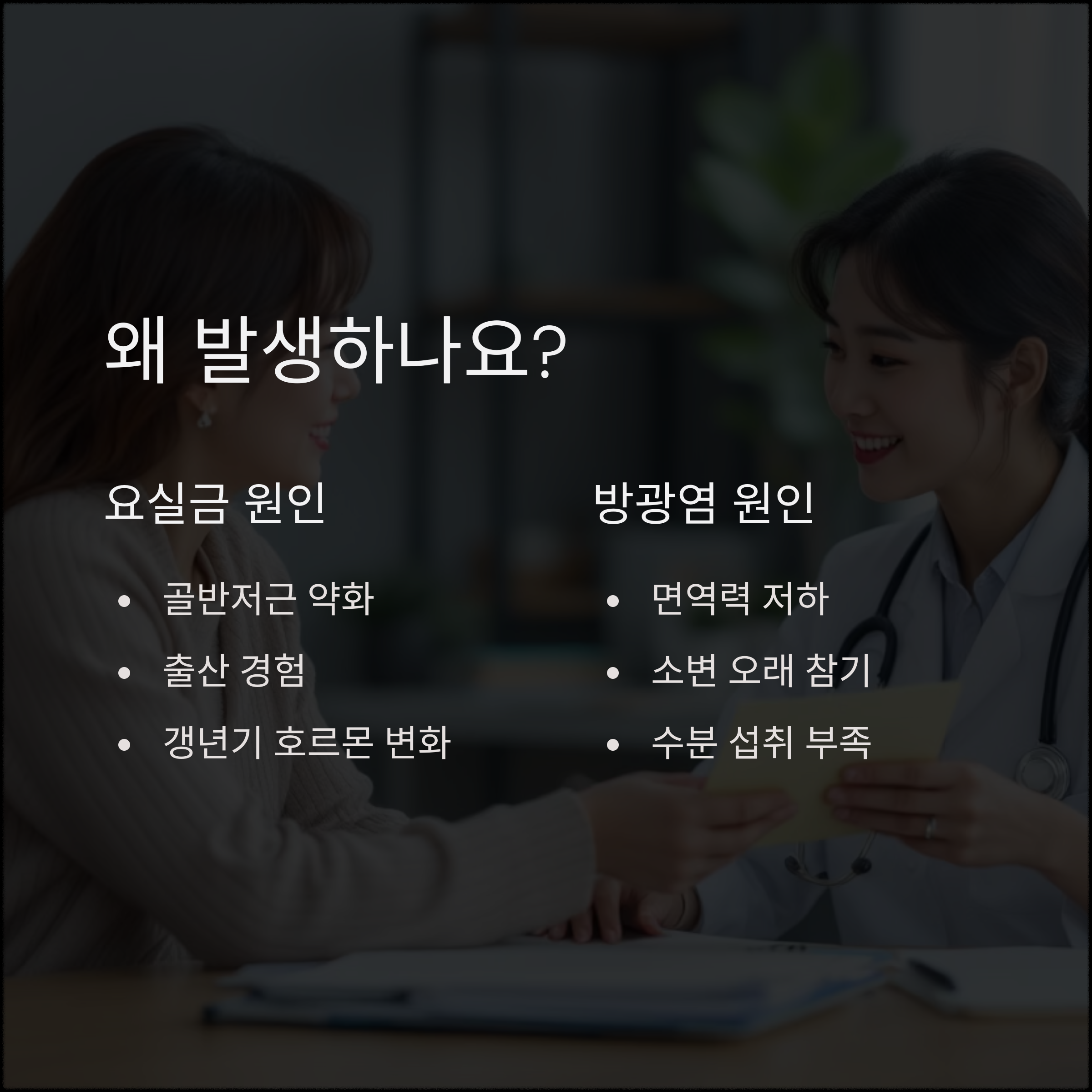 | 골반저근 약화, 호르몬 변화 | 빈뇨, 배뇨 시 통증, 잔뇨감 | 운동, 수분 섭취, 위생 관리 |