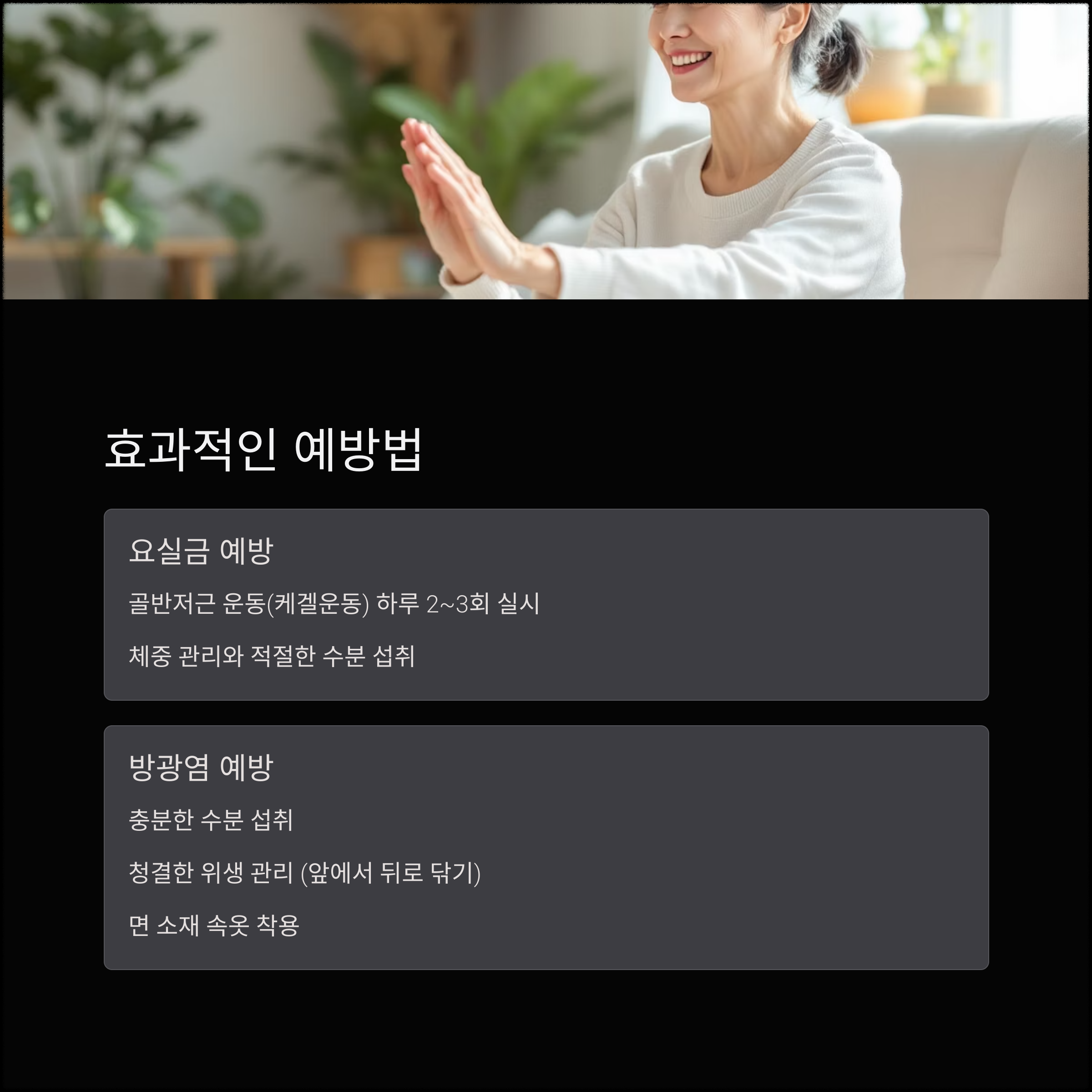 골반저근 약화, 호르몬 변화 | 빈뇨, 배뇨 시 통증, 잔뇨감 | 운동, 수분 섭취, 위생 관리 |
