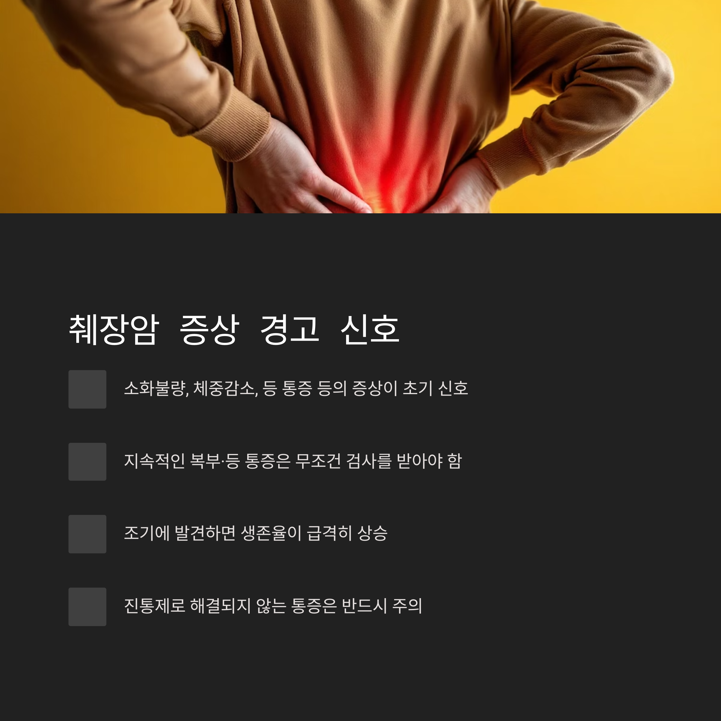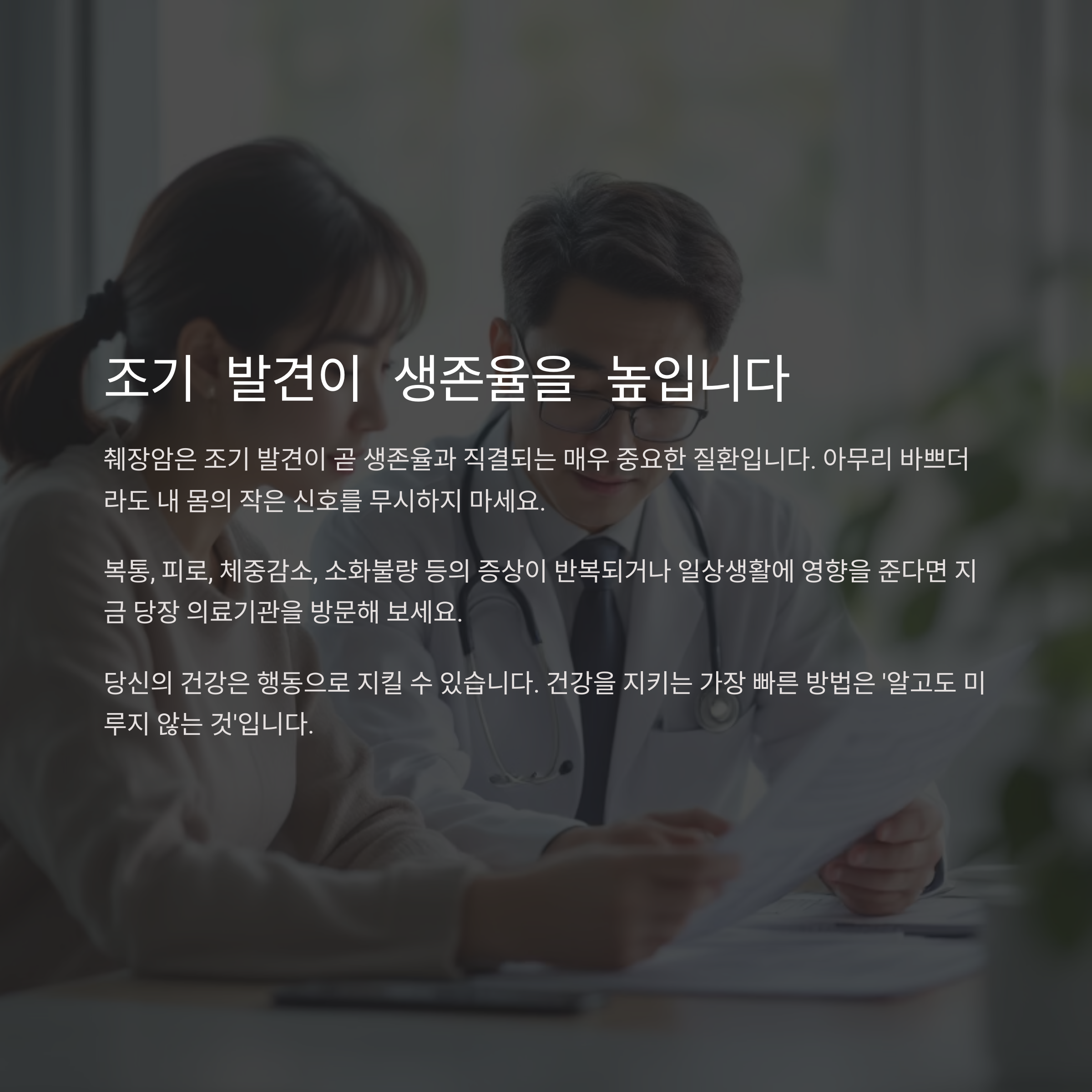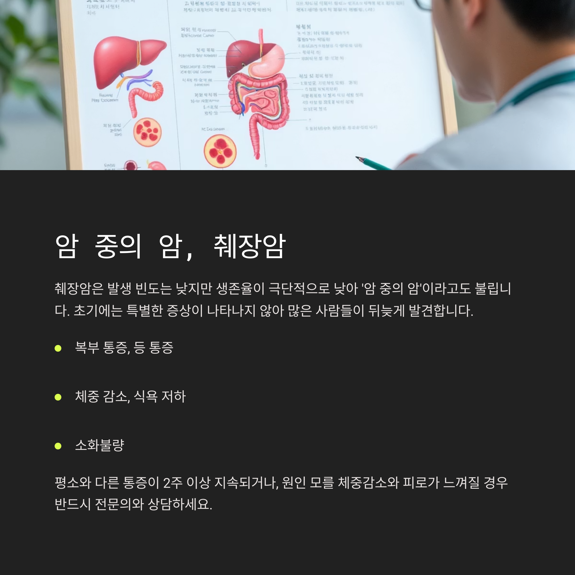 | 소화불량, 체중감소, 등 통증 등의 증상이 초기 신호 | 지속적인 복부·등 통증은 무조건 검사를 받아야 함 | 조기에 발견하면 생존율이 급격히 상승 |
