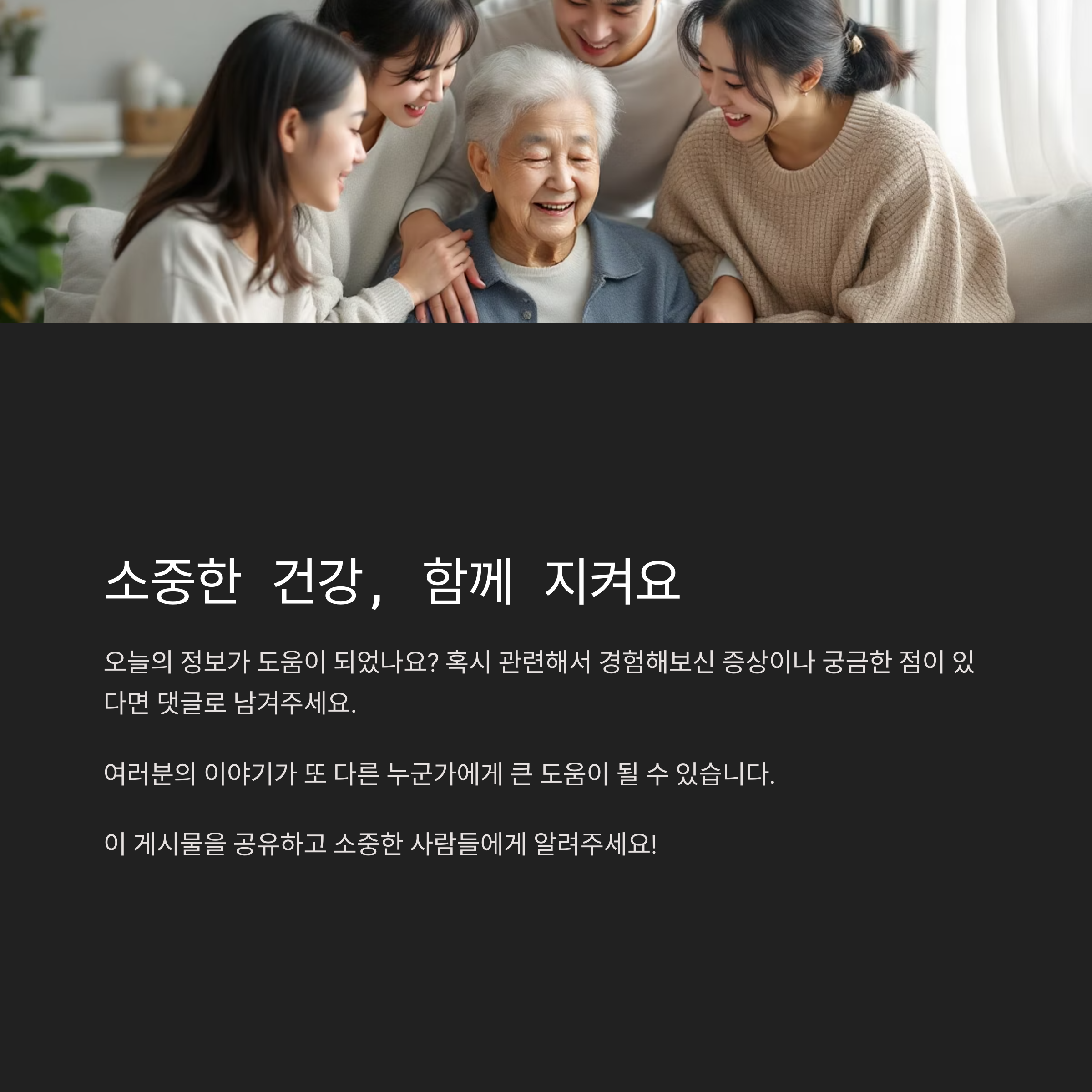 오늘의 글이 도움이 되었나요? 혹시 관련해서 경험해보신 증상이나 궁금한 점이 있다면 댓글로 남겨주세요. 여러분의 이야기가 또 다른 누군가에게 큰 도움이 될 수 있습니다.