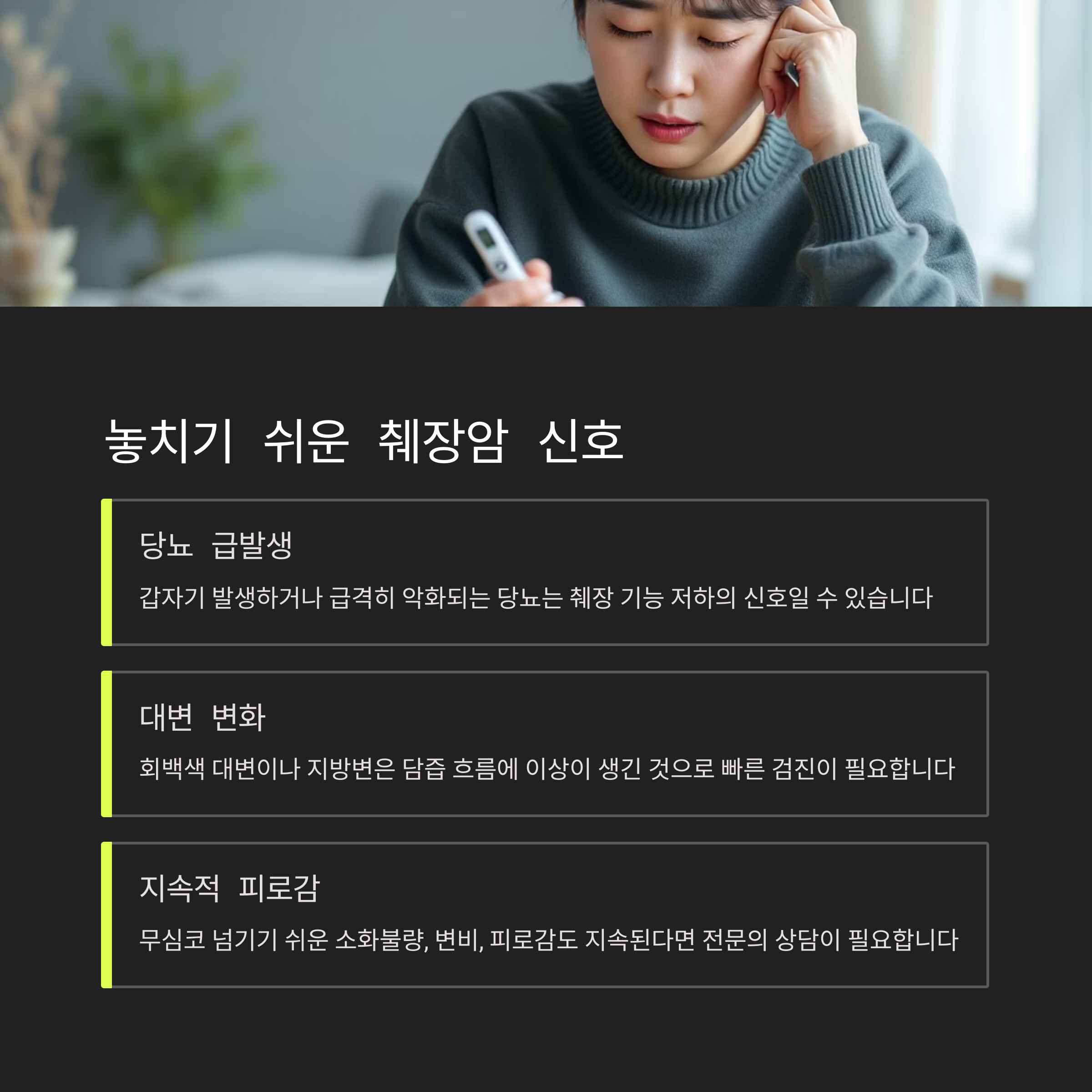 췌장암은 전형적인 암과 다르게 체중 감소와 피로, 통증 외에도 미묘한 생리적 변화를 동반합니다. 특히 당뇨가 갑자기 발생하거나 기존의 당뇨가 급격히 악화되는 경우, 이는 췌장 기능 저하의 신호일 수 있습니다. 또한 대변이 회백색으로 변하거나 지방변이 발생할 경우, 담즙의 흐름에 이상이 생긴 것으로 해석할 수 있어 빠른 검진이 필요합니다. 가장 중요한 것은 ‘평소와 다른 변화’를 놓치지 않는 것입니다. 무심코 넘기기 쉬운 소화불량이나 변비, 피로감도 지속된다면 반드시 전문의 상담을 받아야 합니다. 당신의 건강은 아무도 대신 지켜줄 수 없습니다. 지금 바로 가까운 내과 또는 소화기내과 전문의에게 예약을 잡아보세요. 오늘의 실천이 내일을 바꿉니다.