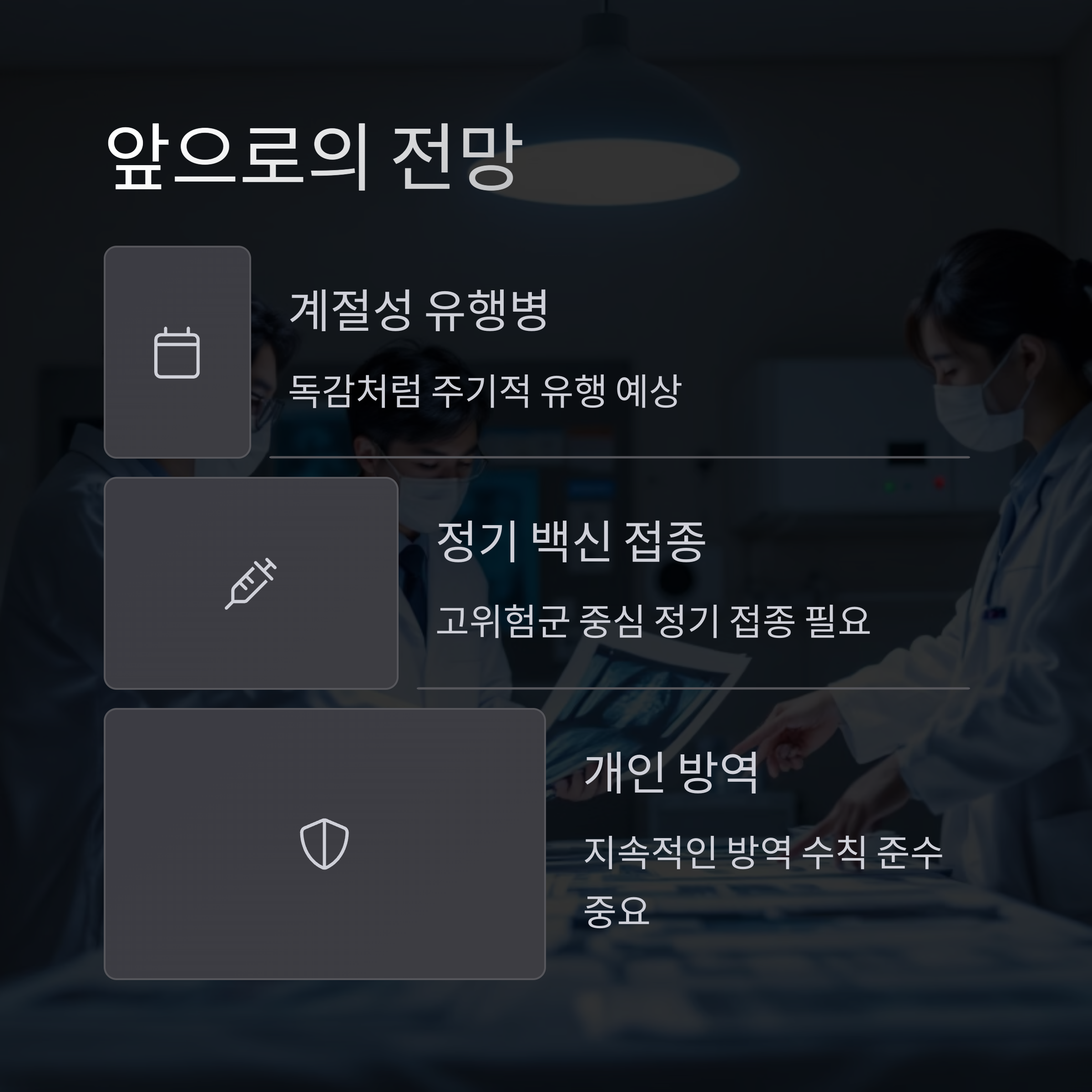 전문가들은 코로나19가 계절성 유행병으로 자리 잡을 가능성이 높다고 보고 있습니다. 따라서 독감처럼 주기적인 백신 접종과 개인 방역 수칙 준수가 필요합니다.