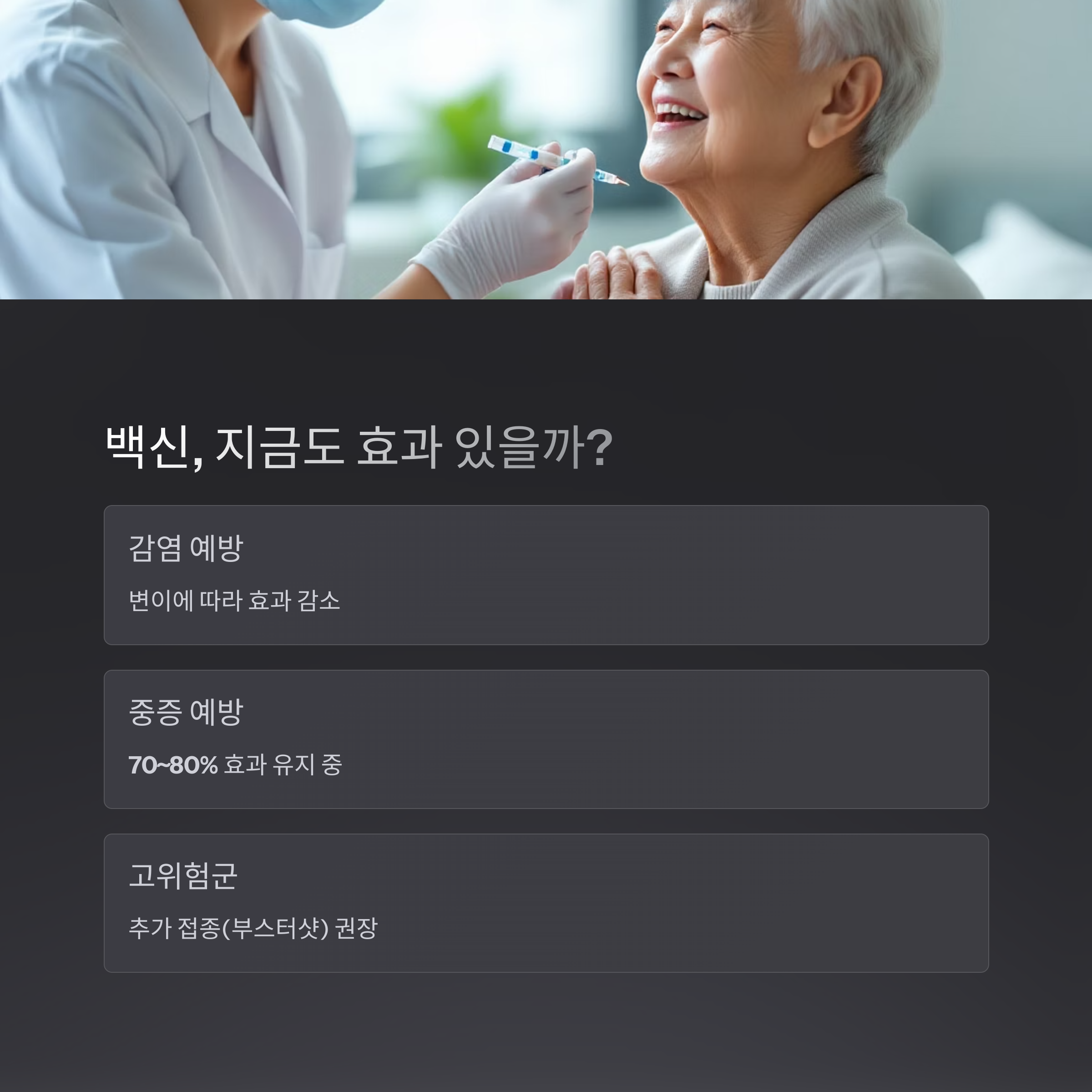 최근 연구 결과를 보면, 변이에 따라 감염 예방률은 낮아졌지만 중증 예방 효과는 여전히 70~80% 수준을 유지하고 있습니다. 이는 백신 접종자의 경우 입원이나 사망 위험이 현저히 낮아진다는 것을 의미합니다.