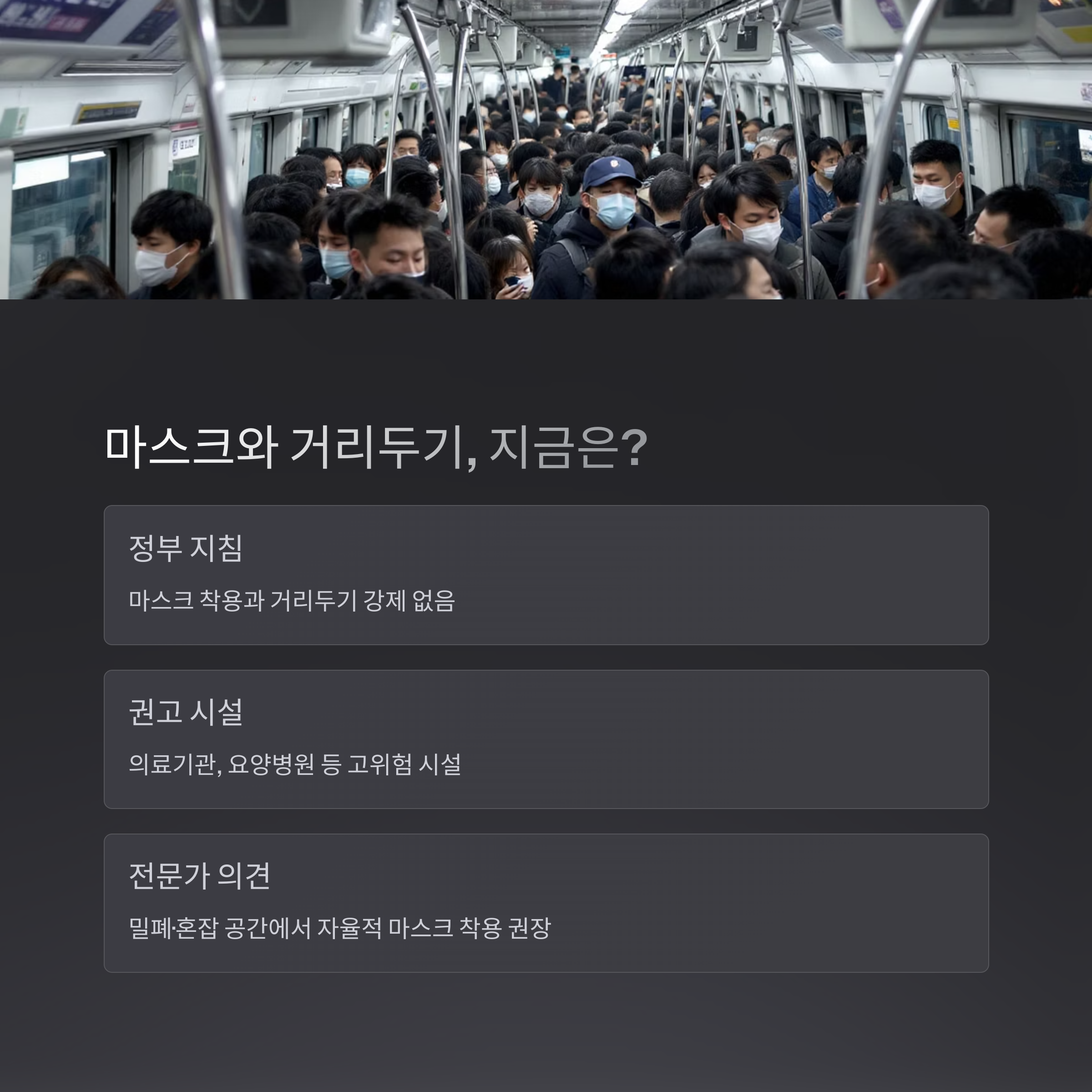 감염내과 전문의들은 "밀폐되고 혼잡한 실내 공간에서는 자율적 마스크 착용이 여전히 유효한 방역 수단"이라고 강조하고 있습니다.