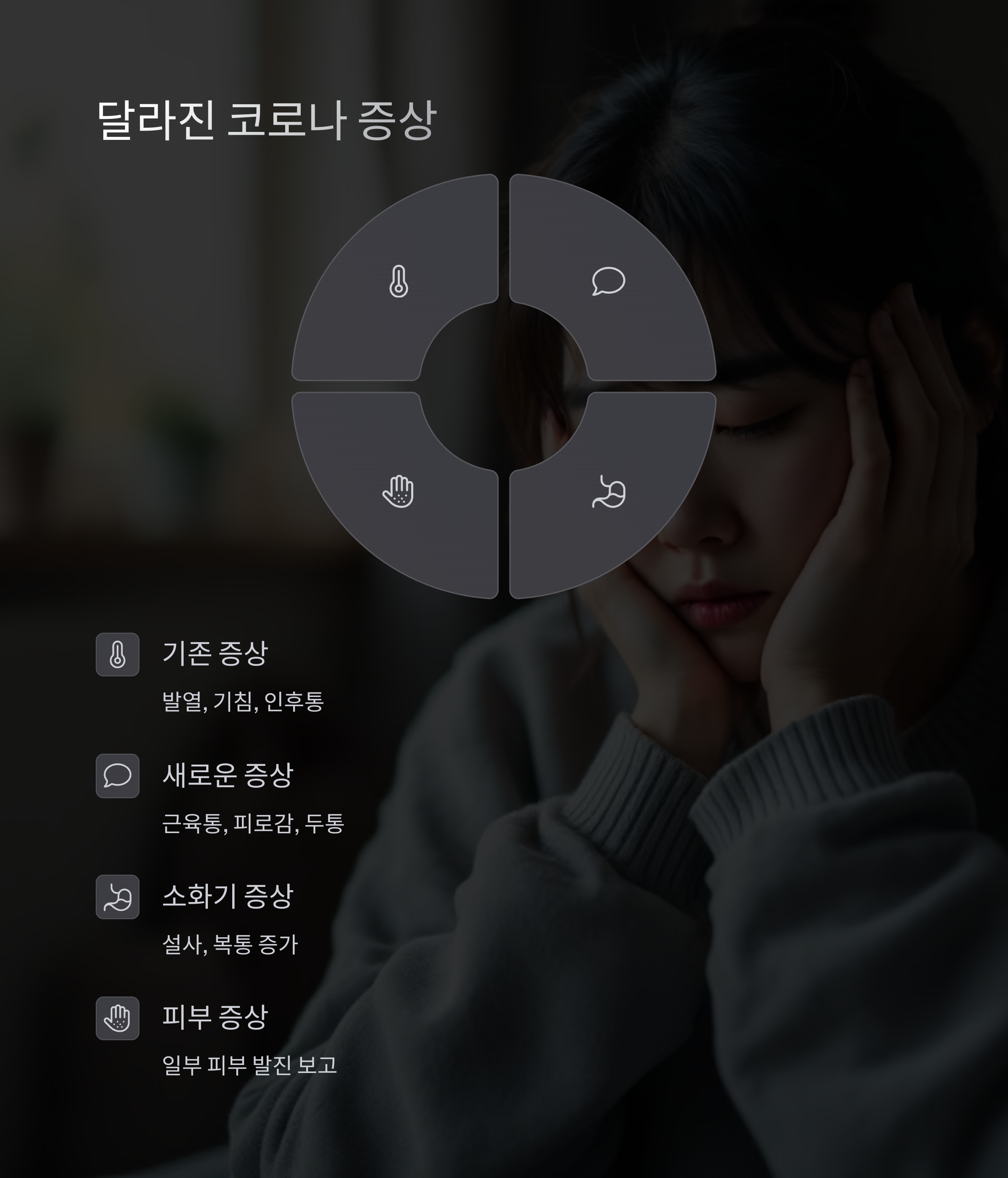 최근 유행 중인 변이 바이러스는 증상 면에서도 다소 차이를 보이고 있습니다. 기존 코로나19 증상이었던 발열, 기침, 인후통 외에도 근육통, 피로감, 두통 등의 비특이적 증상이 증가했습니다. 또한 일부에서는 소화기 증상(설사, 복통)이나 피부 발진을 보고하기도 했습니다.
