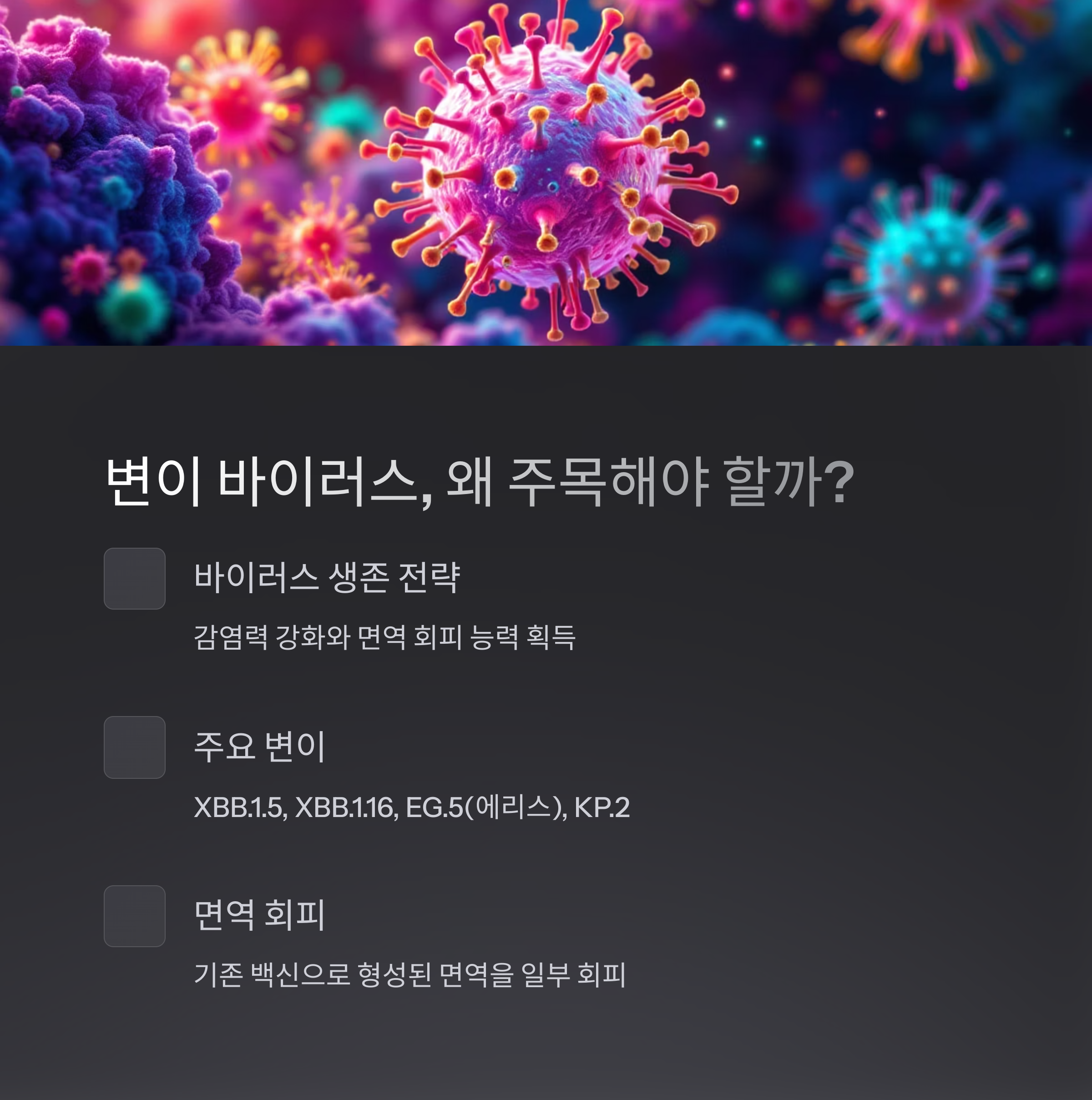 전 세계적으로 코로나19는 여전히 우리의 일상과 건강에 큰 영향을 미치고 있습니다. 최근에는 다양한 코로나 변이 바이러스가 등장하면서 또다시 경각심이 높아지고 있습니다. 백신 효과는 어떤지, 현재 어떤 변이가 확산 중인지, 앞으로 무엇을 준비해야 하는지에 대해 정확하고 상세한 정보를 정리해드립니다.