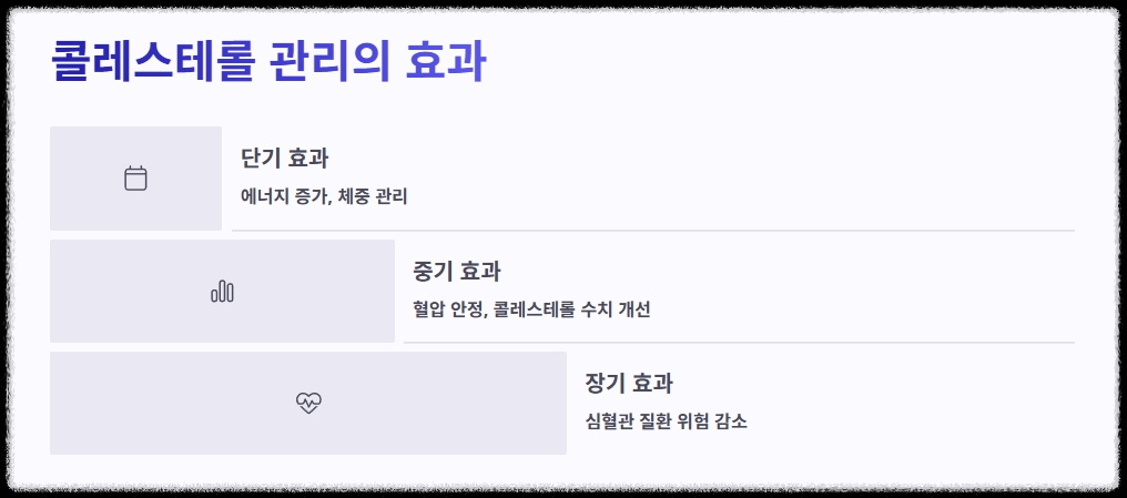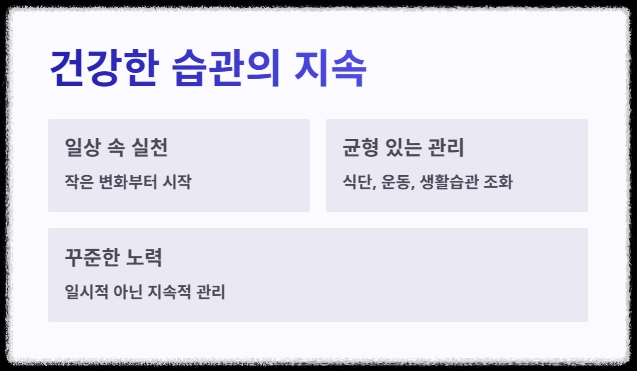 콜레스테롤 관리는 단순히 일시적인 노력이 아니라 일상 속 습관화가 가장 중요합니다. 식단, 운동, 생활 습관을 균형 있게 조절하는 것이 건강한 혈관을 지키는 지름길입니다. 하루하루 실천을 통해 심혈관 질환을 예방하고, 활기찬 삶을 이어가세요.