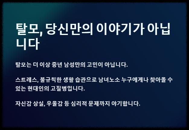 - 스트레스 : 만병의 근원인 스트레스는 탈모의 주요 원인 중 하나입니다. 스트레스는 혈액 순환을 방해하고 호르몬 불균형을 초래하여 모발 성장을 억제합니다.