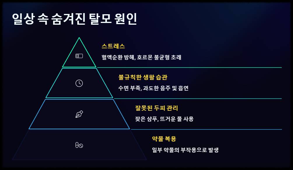 탈모는 유전적인 요인 외에도 다양한 일상 속 요인들에 의해 악화될 수 있습니다.