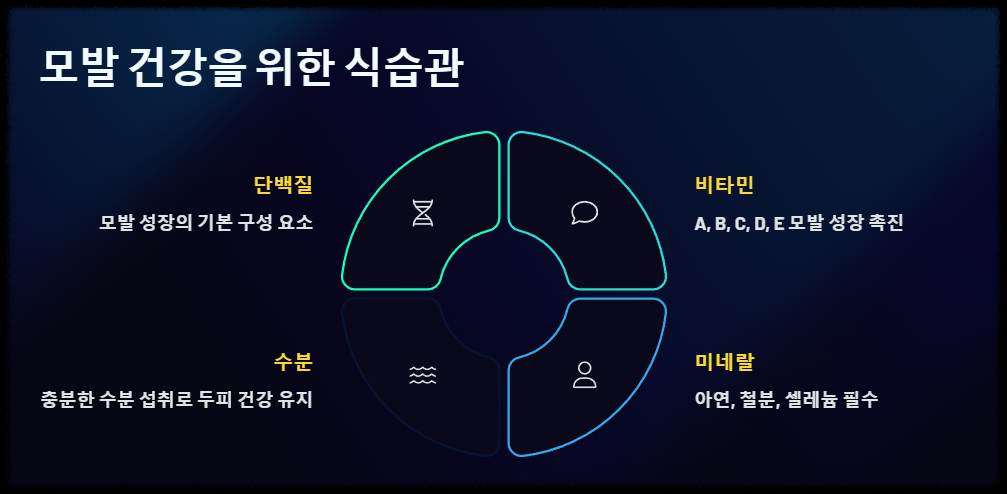 - 건강한 식습관 : 단백질, 비타민, 미네랄 등 모발 성장에 필요한 영양소를 충분히 섭취합니다.