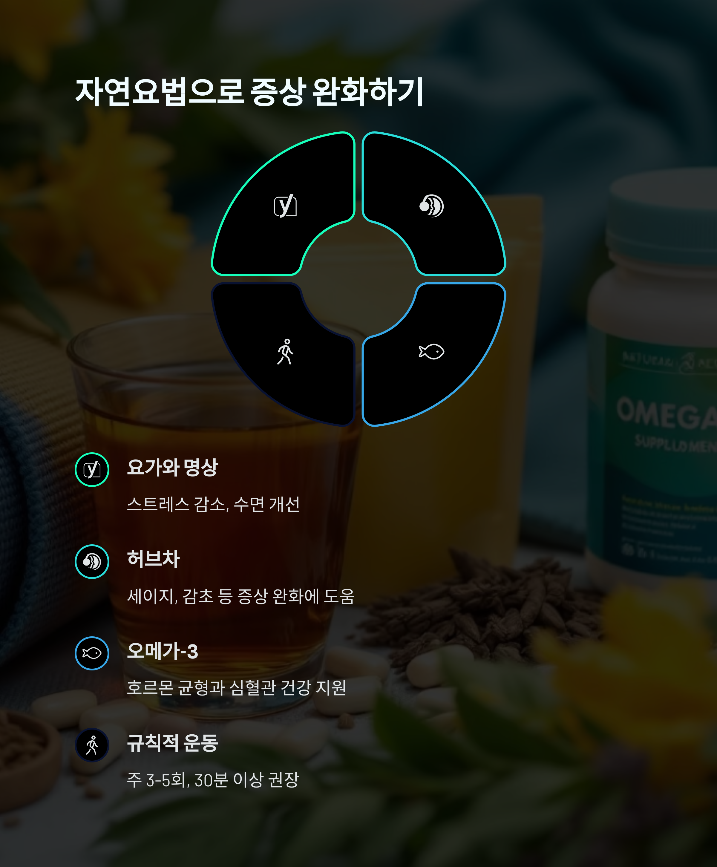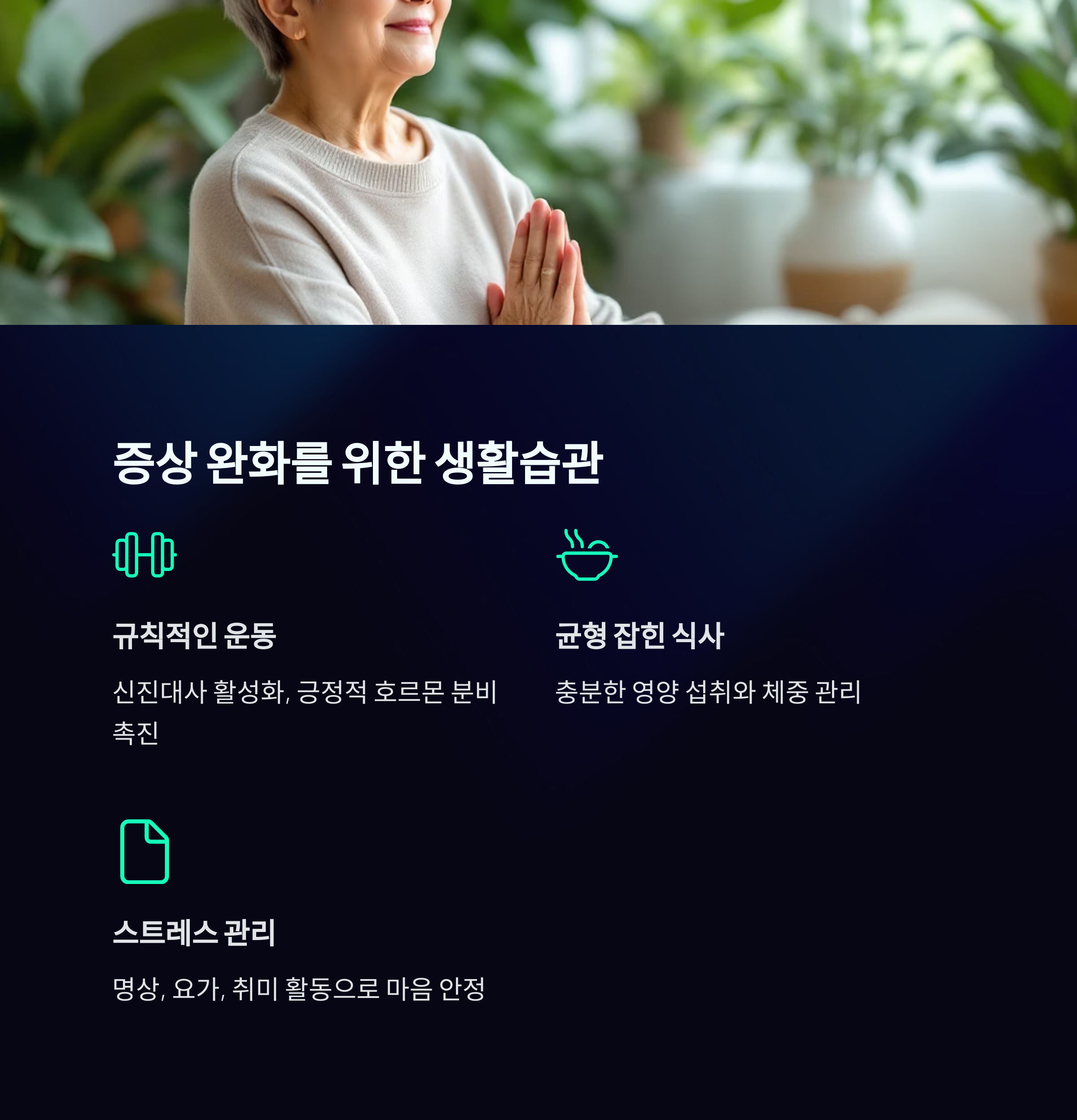 | 증상 완화 방법 | 규칙적인 운동, 균형 잡힌 식사, 스트레스 관리가 중요합니다. |