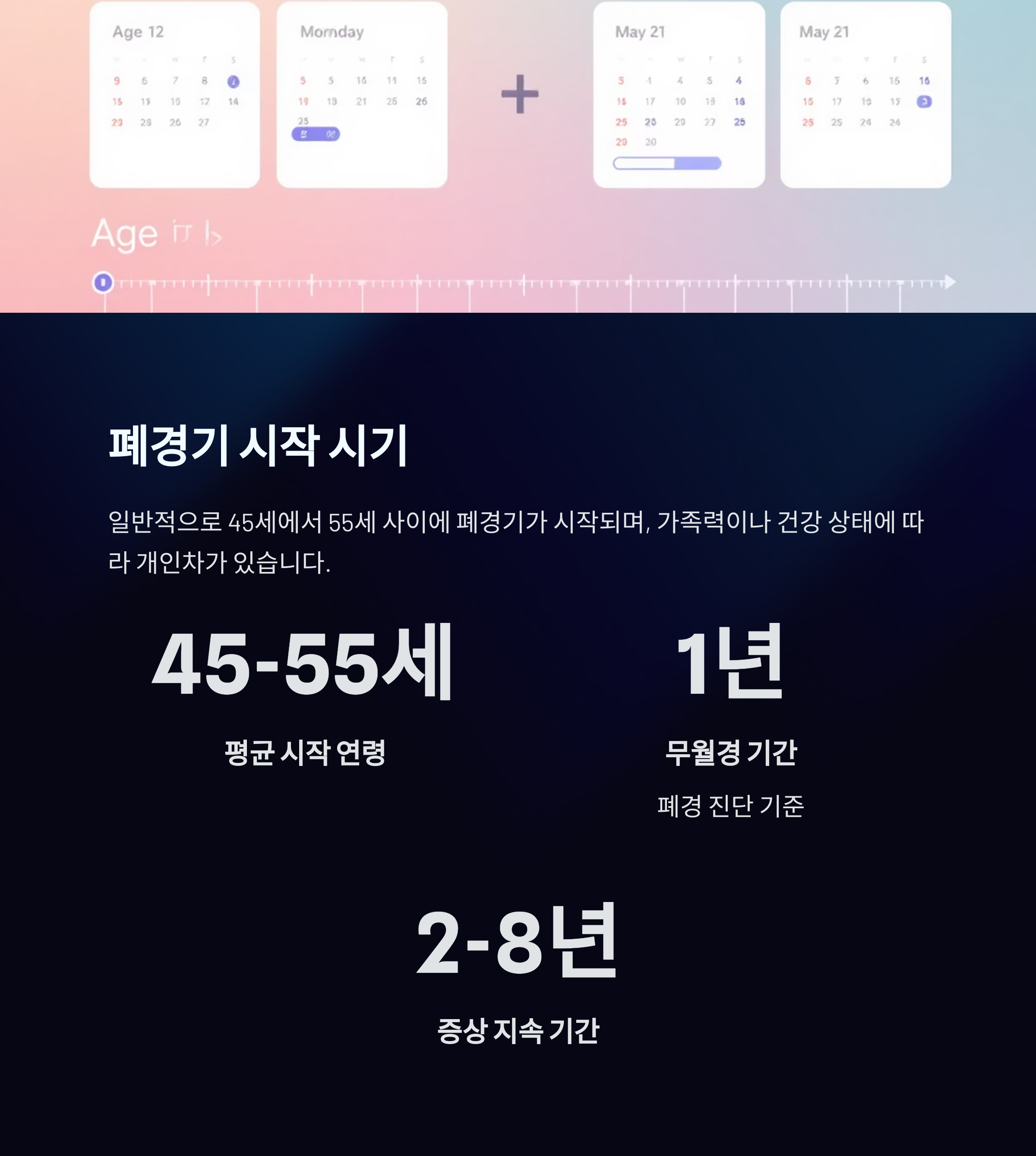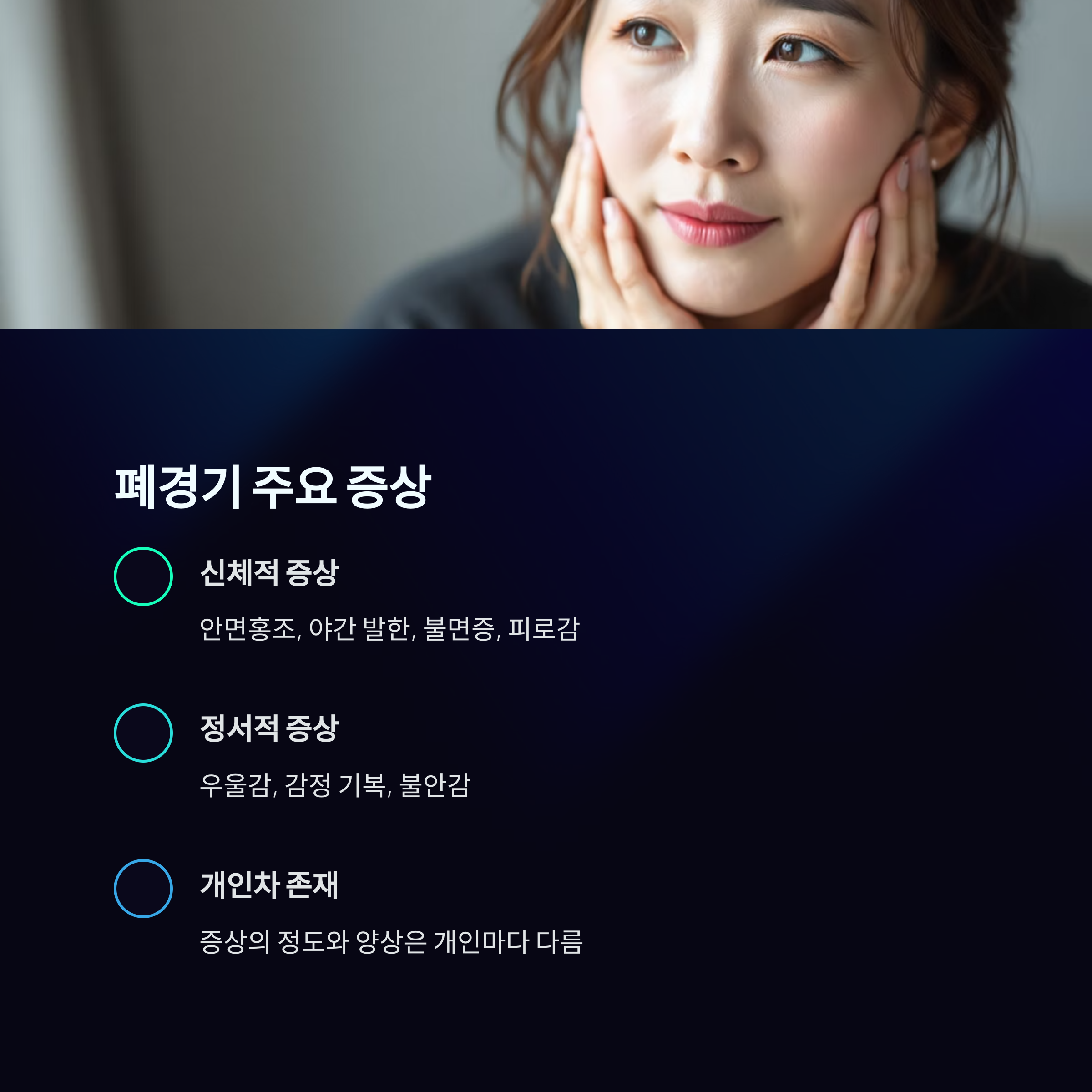 | 폐경기 주요 증상 | 안면홍조, 발한, 불면증, 우울감 등이 나타납니다. |