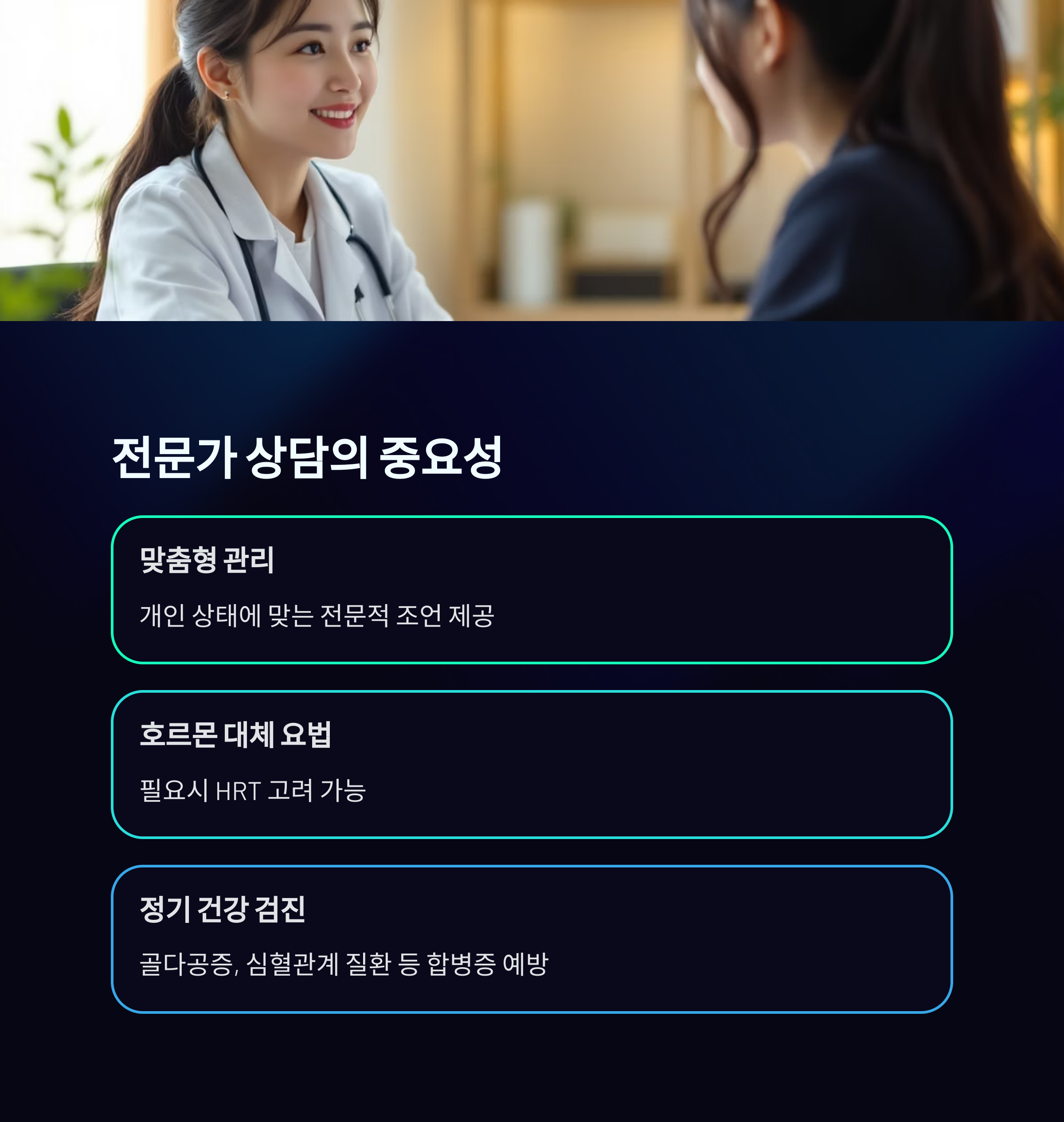 | 안면홍조, 발한, 불면증, 우울감 | 운동, 식이요법, 스트레스 관리 | 건강 검진, 전문가 상담, 생활습관 개선 |