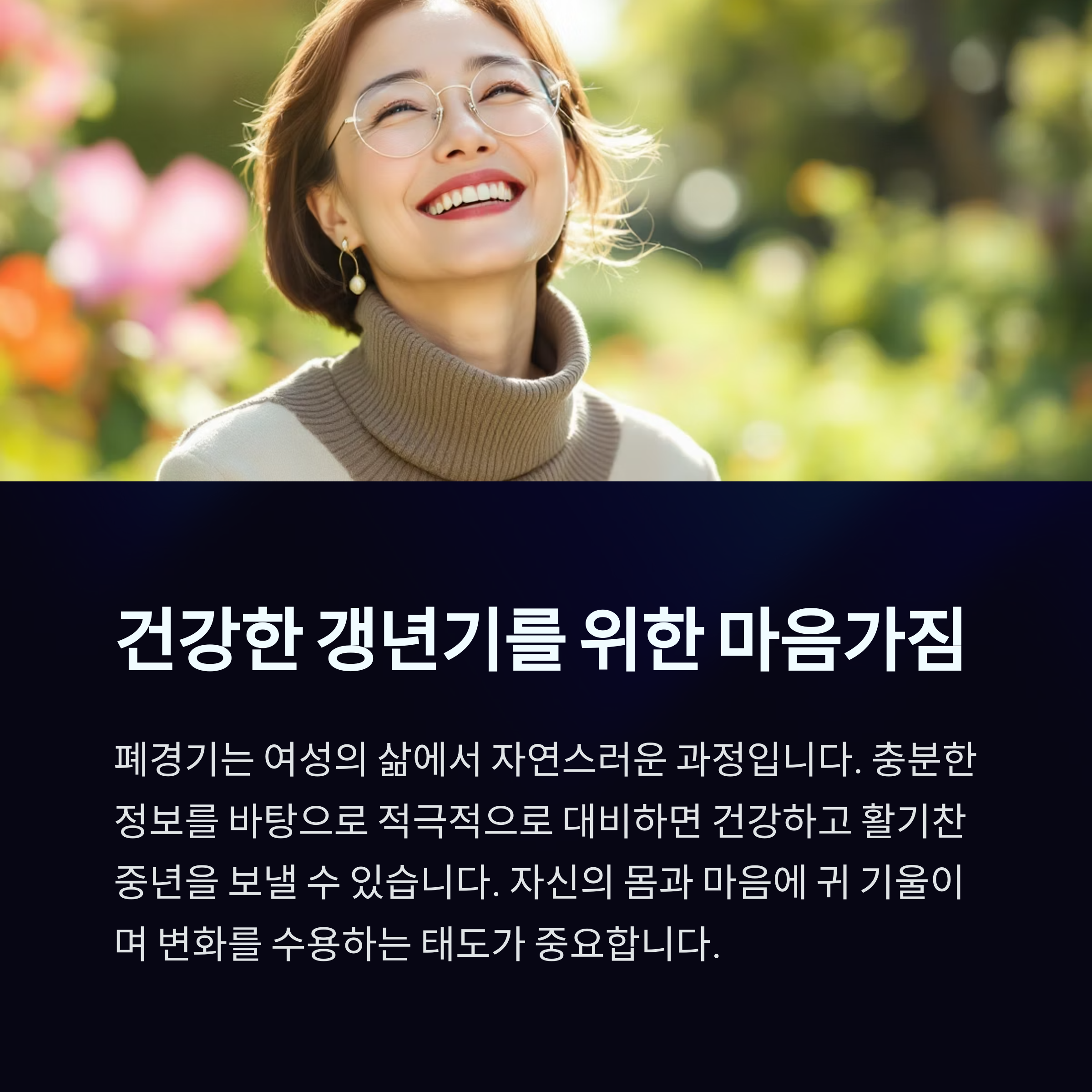 폐경기는 여성의 삶에서 자연스러운 과정입니다. 충분한 정보를 바탕으로 적극적으로 대비하면 건강하고 활기찬 중년을 보낼 수 있습니다. 무엇보다 중요한 것은 자신의 몸과 마음에 귀 기울이며 변화를 수용하고 관리하는 태도입니다. 오늘 소개해드린 증상과 완화 방법, 체크리스트를 참고하시어 보다 편안한 갱년기 생활을 준비하시길 바랍니다. 언제나 건강과 행복이 함께 하시길 응원합니다.