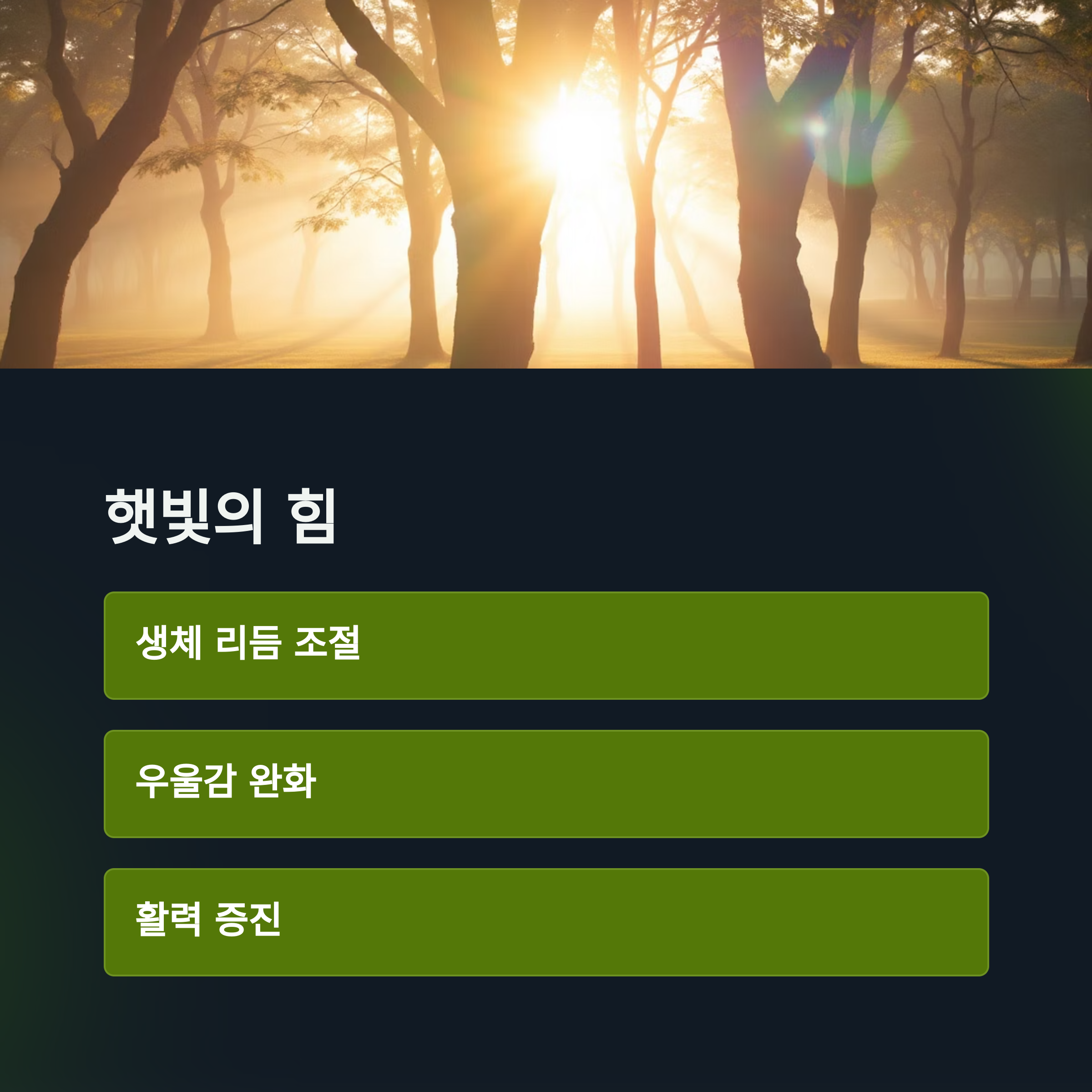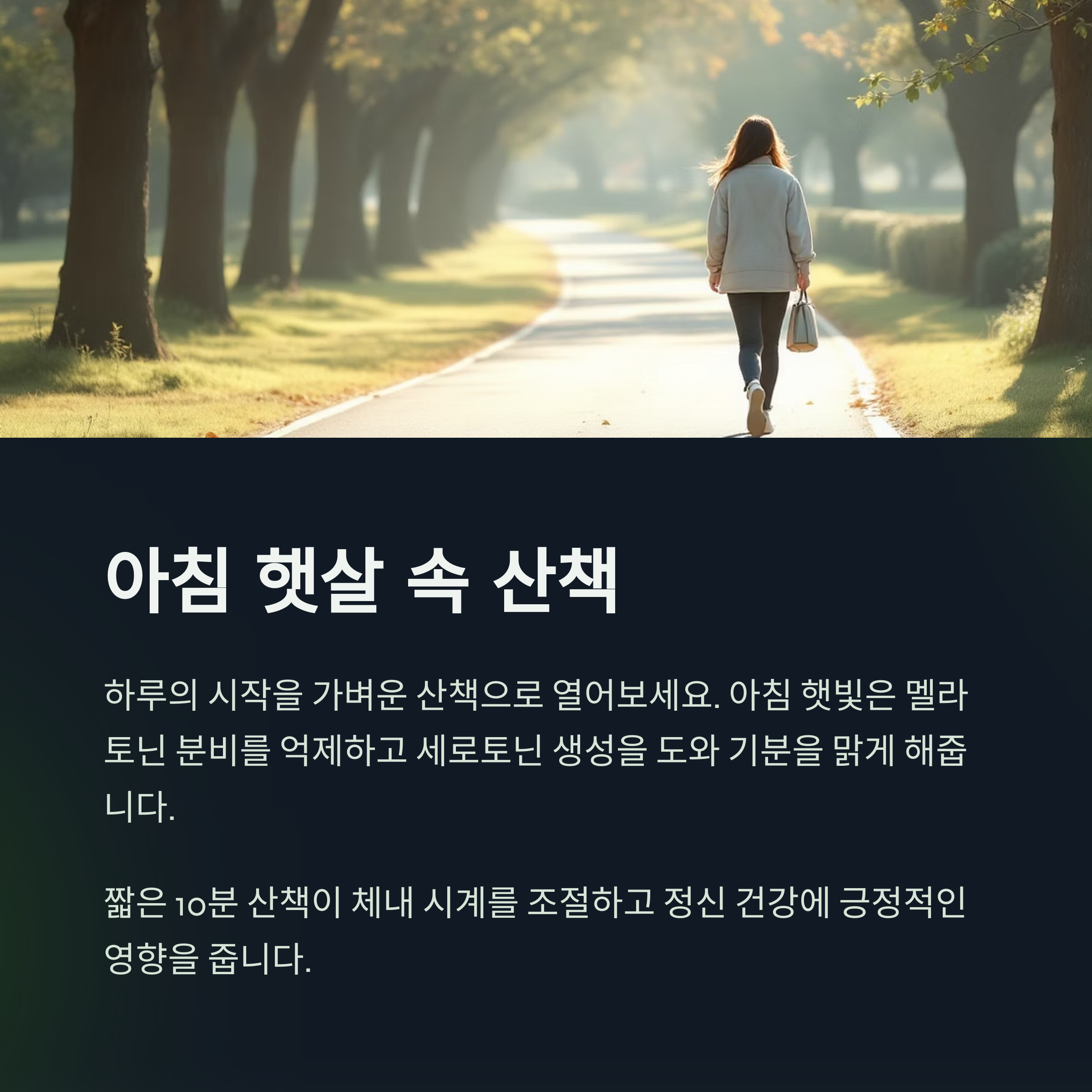 햇빛 노출은 생체 리듬을 조절하고 우울감 완화에 도움을 줍니다.