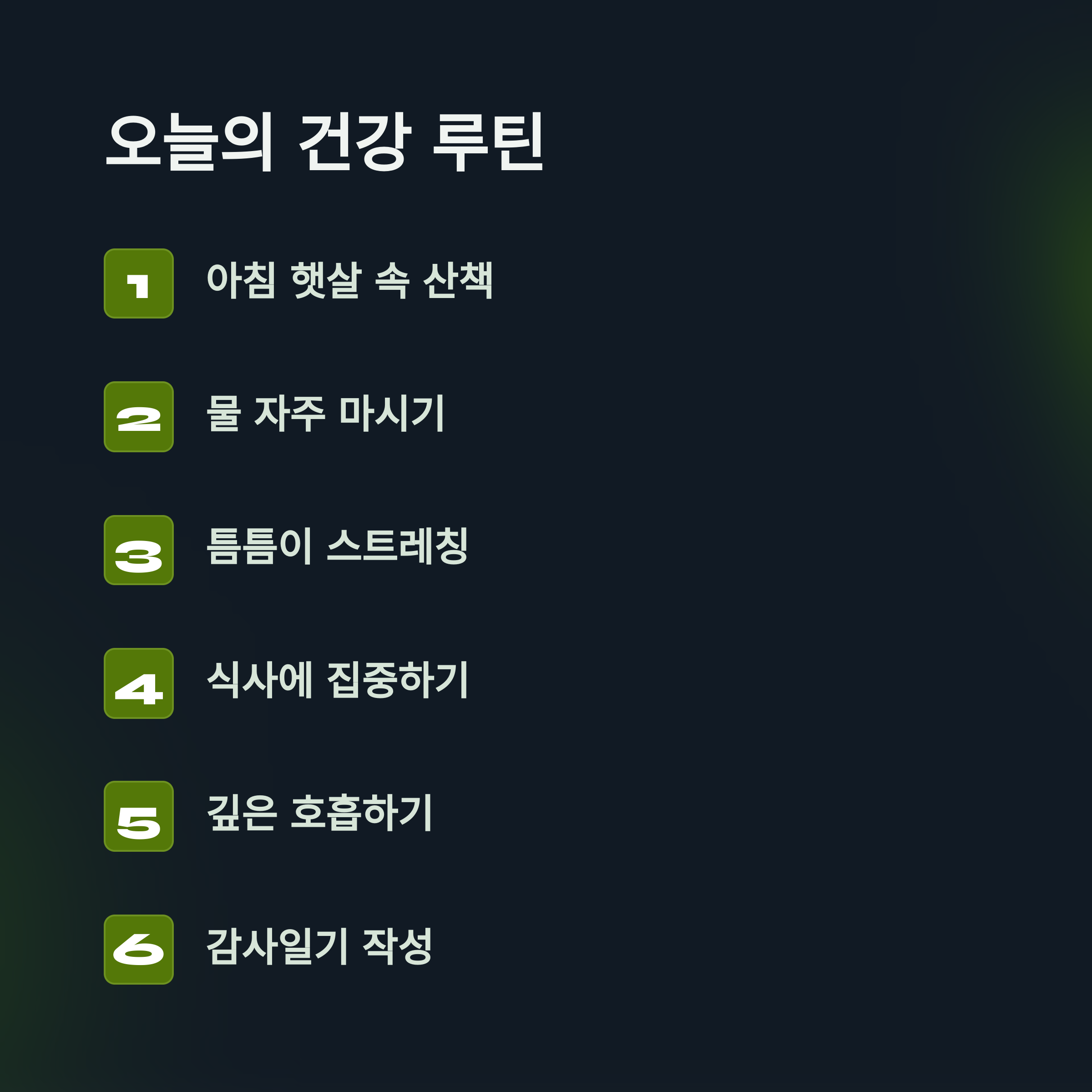 바쁜 하루 속, 여러분은 건강을 얼마나 챙기고 계신가요? 작은 습관 하나가 우리의 삶을 얼마나 크게 바꿀 수 있는지 아시나요? 오늘은 시간에 쫓기는 현대인들을 위한, 누구나 쉽게 실천할 수 있는 건강 루틴 6가지를 소개합니다.