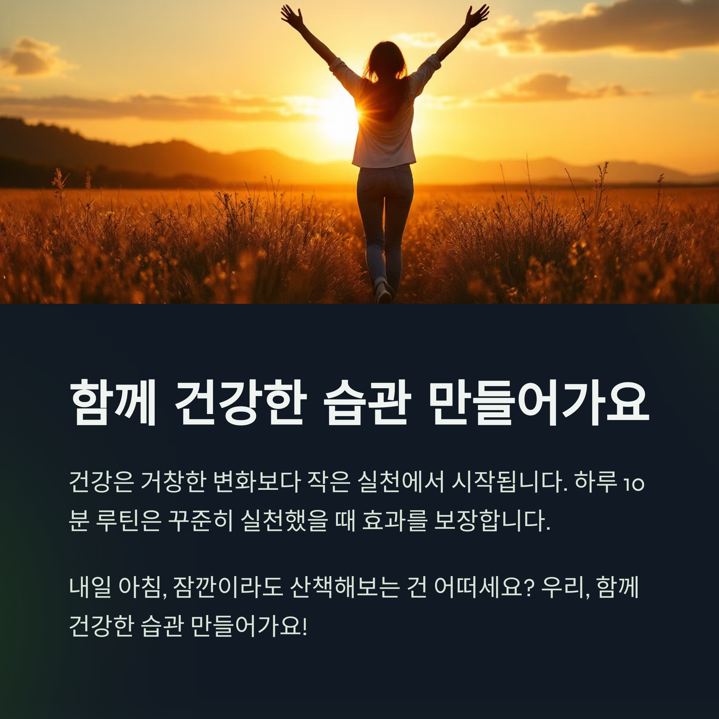 여러분, 건강은 거창한 변화보다 작은 실천에서 시작됩니다. 오늘 소개해드린 하루 10분 루틴은 그 어떤 운동보다도 꾸준히 실천했을 때 효과를 보장합니다. 내일 아침, 잠깐이라도 산책해보는 건 어떠세요? 여러분의 하루가 조금 더 맑고 건강해지길 진심으로 응원합니다. 우리, 함께 건강한 습관 만들어가요!