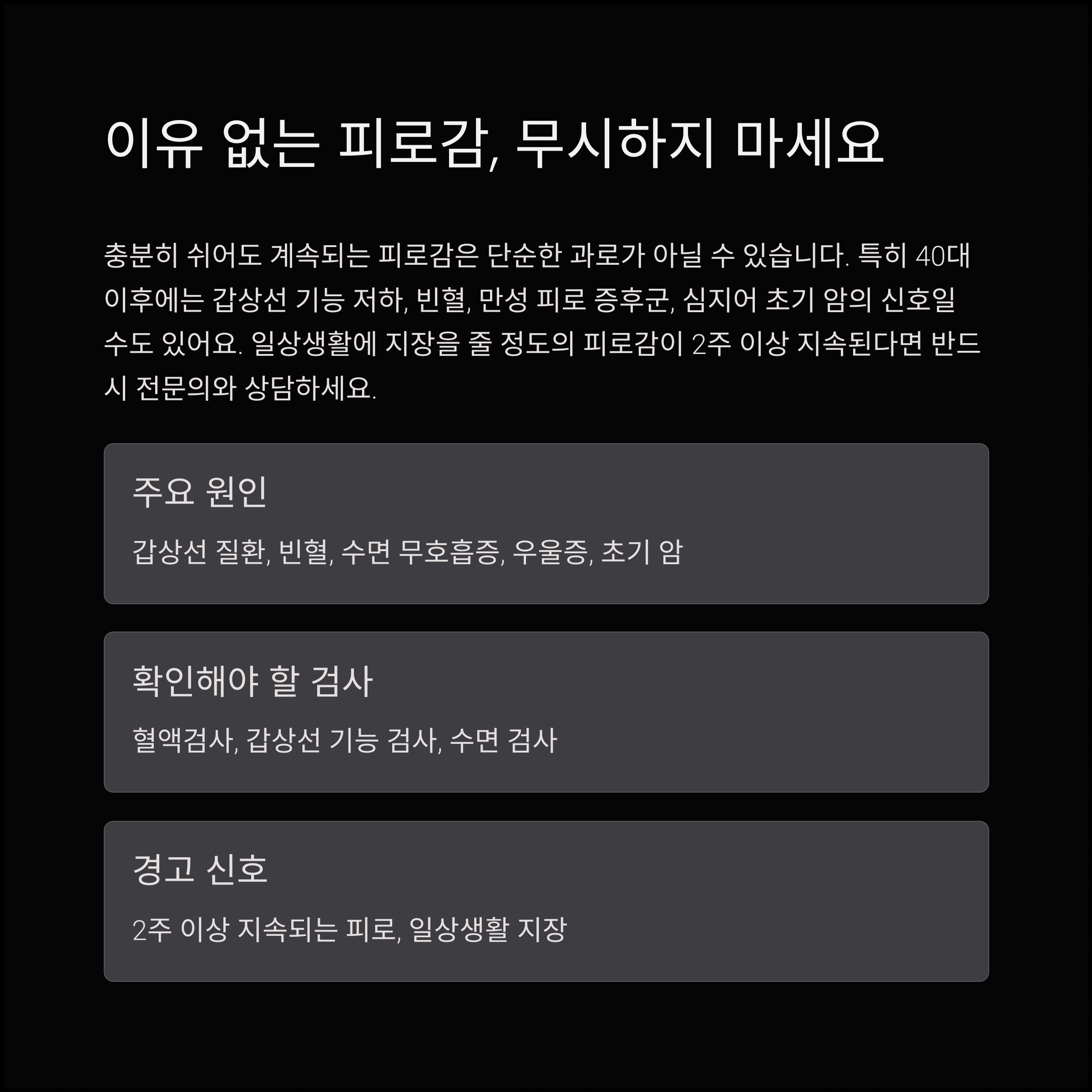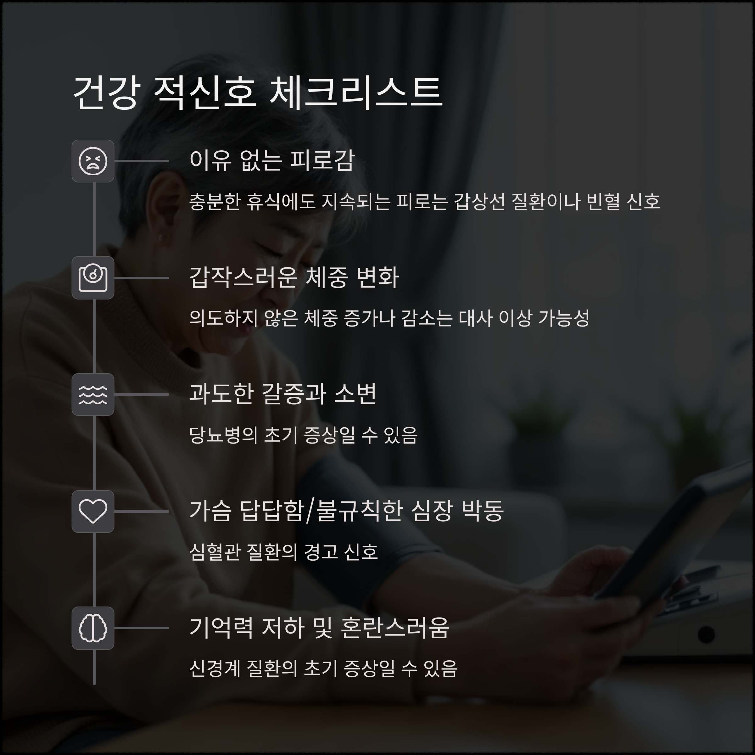 특히 40대 이후가 되면 작은 증상 하나하나가 단순한 피로가 아닌, 몸이 보내는 중요한 이상신호일 수 있습니다.