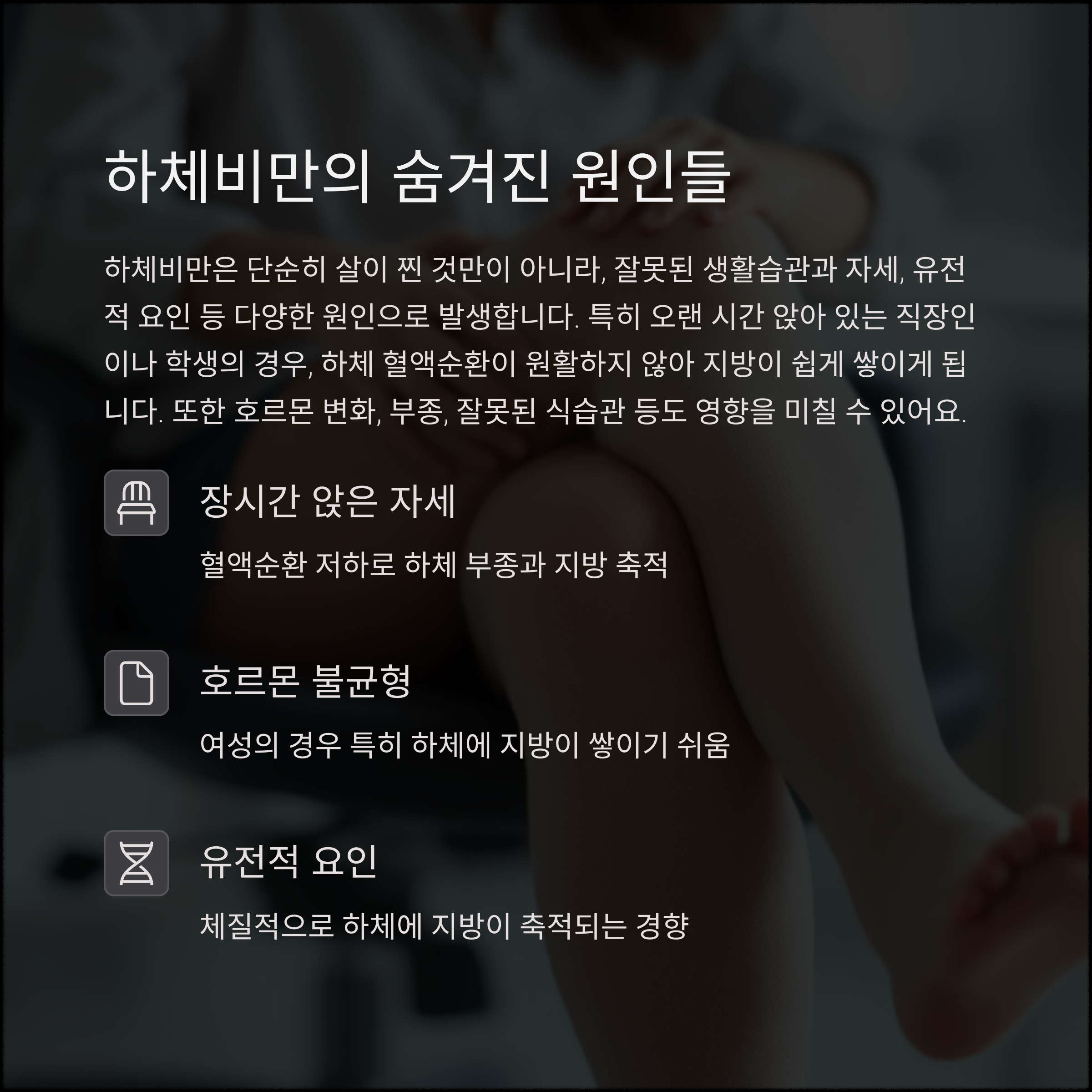 하체비만은 단순히 살이 찐 것만이 아니라, 잘못된 생활습관과 자세, 유전적 요인 등 다양한 원인으로 발생합니다. 특히 오랜 시간 앉아 있는 직장인이나 학생의 경우, 하체 혈액순환이 원활하지 않아 지방이 쉽게 쌓이게 됩니다. 또한 호르몬 변화, 부종, 잘못된 식습관 등도 영향을 미칠 수 있어요.