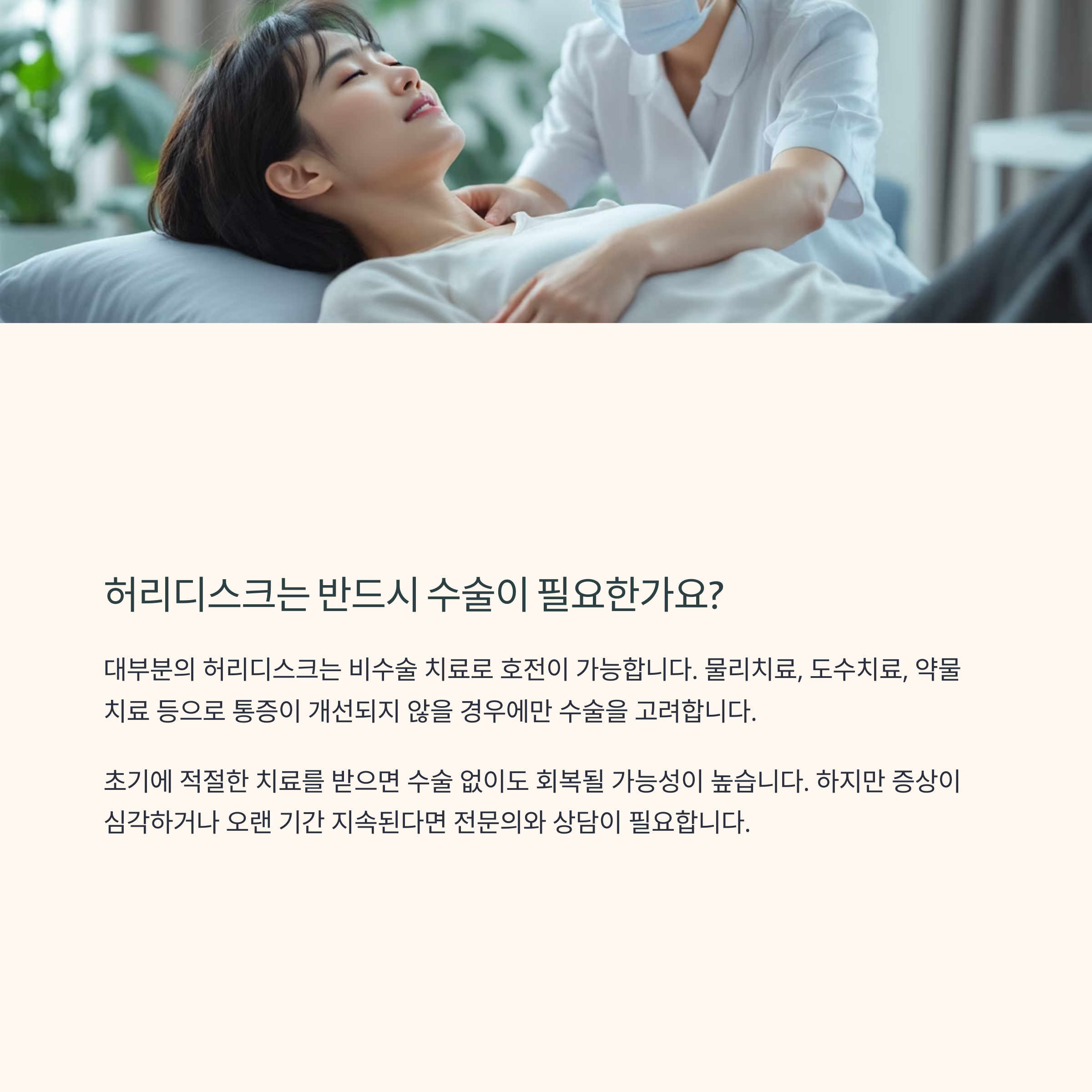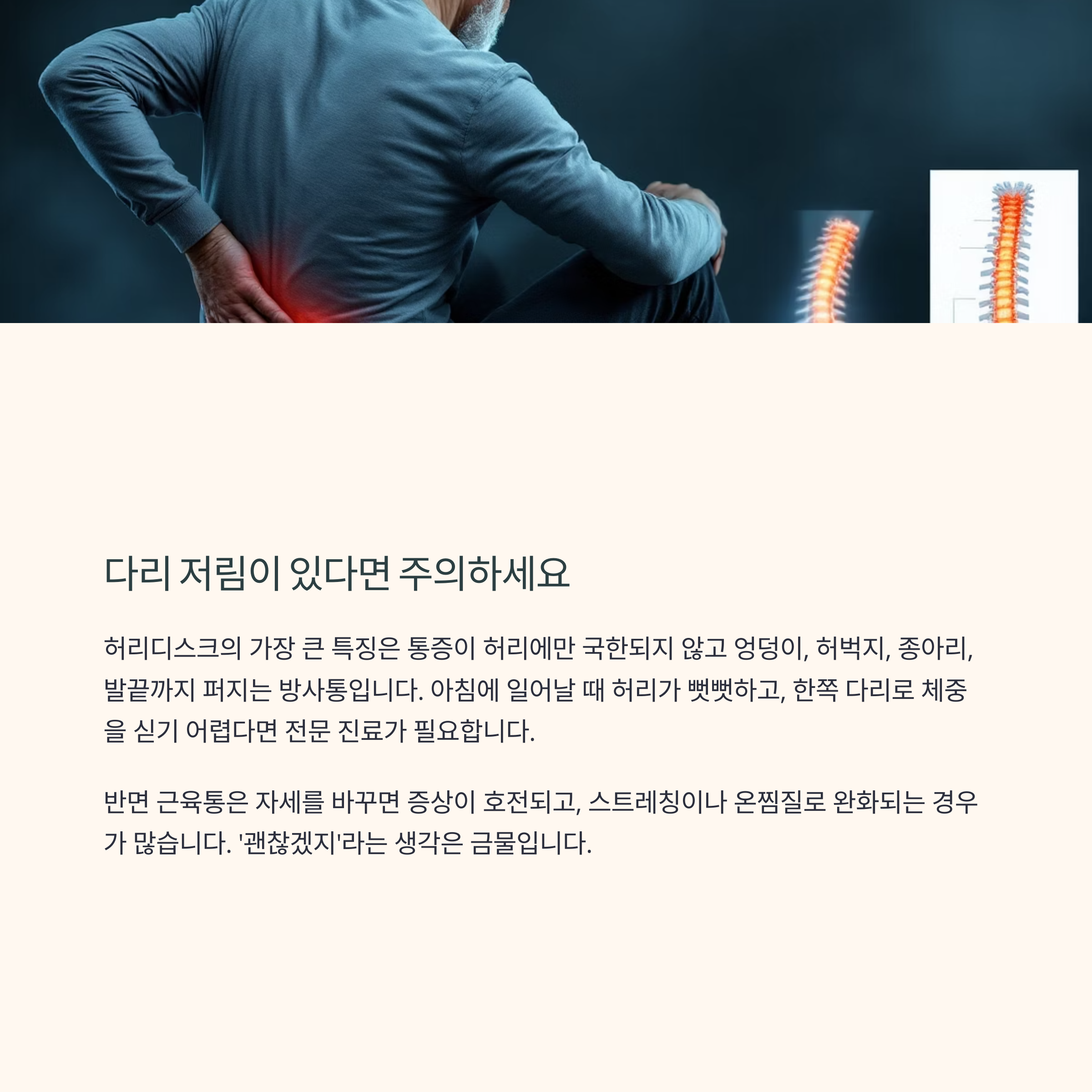 요즘 들어 갑자기 허리가 아프거나 다리까지 저린 증상이 동반되었다면, 이게 단순 근육통인지 아니면 허리디스크 때문인지 구별하기 어려워 고민하신 적 있으시죠? 특히 장시간 앉아있는 일이 많거나 무거운 것을 들다 삐끗한 후 통증이 시작되었다면 그 원인을 정확히 파악해야 적절한 치료와 회복이 가능합니다. 많은 분들이 단순히 뻐근하거나 근육이 뭉친 정도로 생각하다가 실제로는 허리디스크인 경우가 많고, 반대로 디스크로 착각했지만 단순한 근육통에 불과했던 사례도 적지 않습니다. 이 두 증상은 치료 접근 방식이 완전히 다르기 때문에 잘못된 판단은 회복 시기를 늦추고 증상을 악화시킬 수 있습니다. 따라서 이 글에서는 허리디스크와 근육통을 명확하게 구별하는 방법과 함께, 실제로 다리 저림이 동반될 때 어떤 신호를 놓치지 말아야 하는지에 대해 자세히 알려드립니다. 의심 증상이 있다면 지금 바로 체크하고, 적절한 대응을 시작하세요. 무엇보다도 방치하지 않는 것이 가장 중요합니다. 지금 이 순간의 정보가 회복의 방향을 바꿀 수 있다는 사실, 기억하세요.