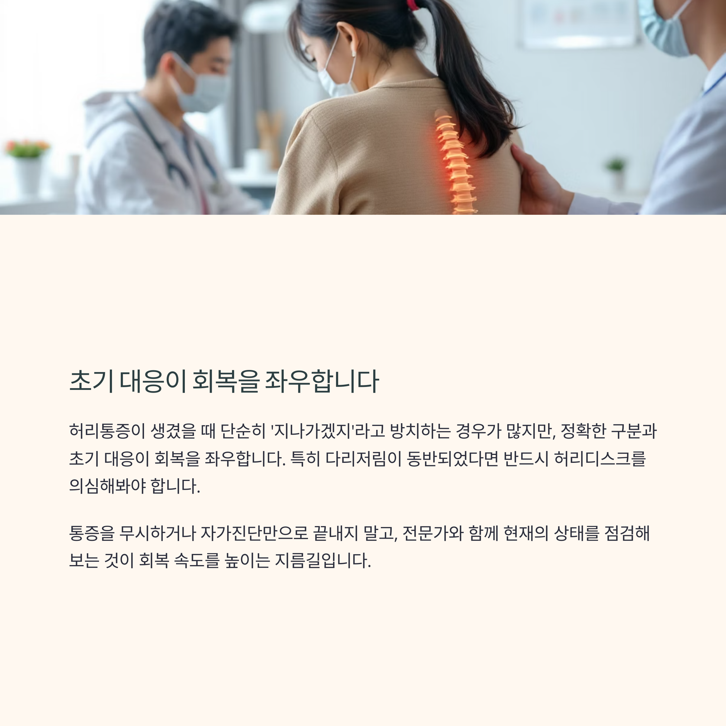 | 허리디스크 초기증상 | 엉덩이, 다리까지 통증 또는 저림 증상이 퍼집니다 |