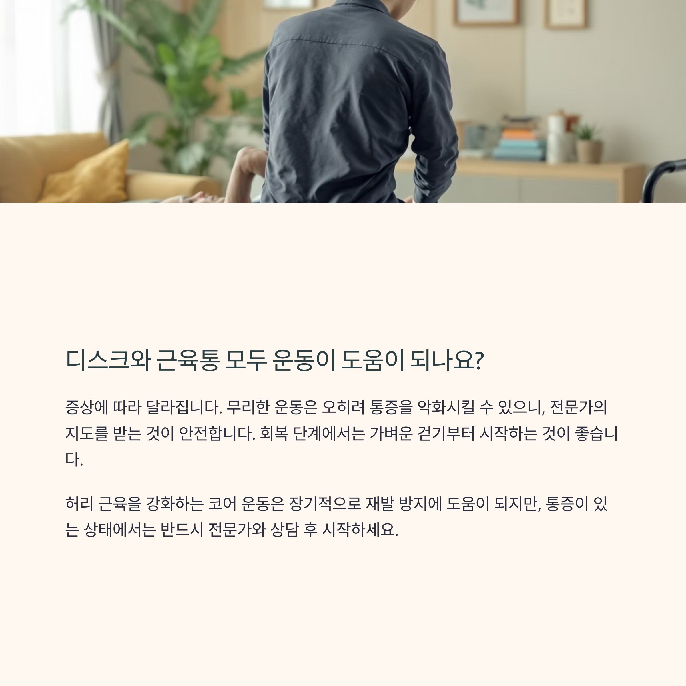 | 방사통 동반, 신경 눌림 증상, 자세에 따른 악화 | 무리한 움직임 후 발생, 국소 통증, 휴식 시 호전 | 신경 압박 시 지속 발생, 마비감 동반 가능 |