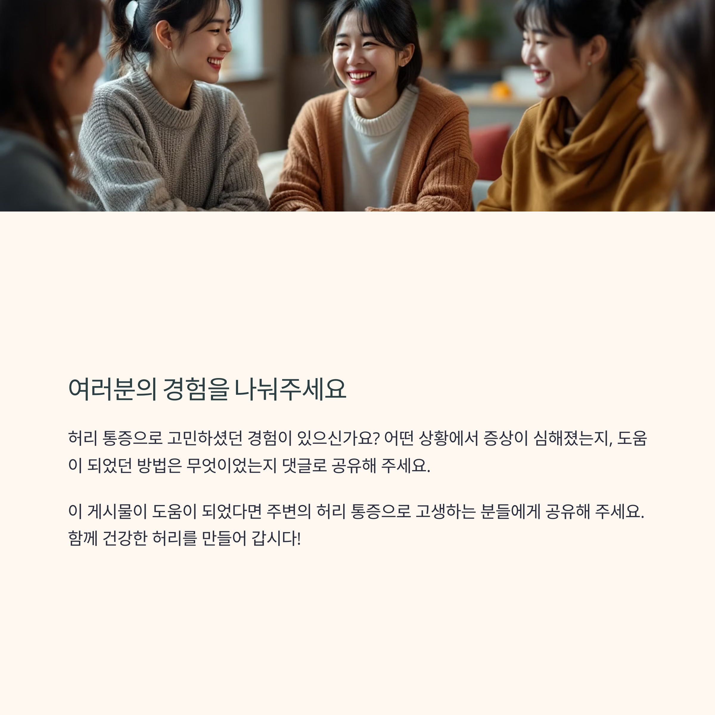 평소 허리 통증으로 고민하신 경험이 있으신가요? 어떤 상황에서 증상이 심해졌는지, 도움이 되었던 방법은 무엇이었는지 댓글로 공유해 주세요. 다른 분들에게도 큰 도움이 될 수 있습니다.