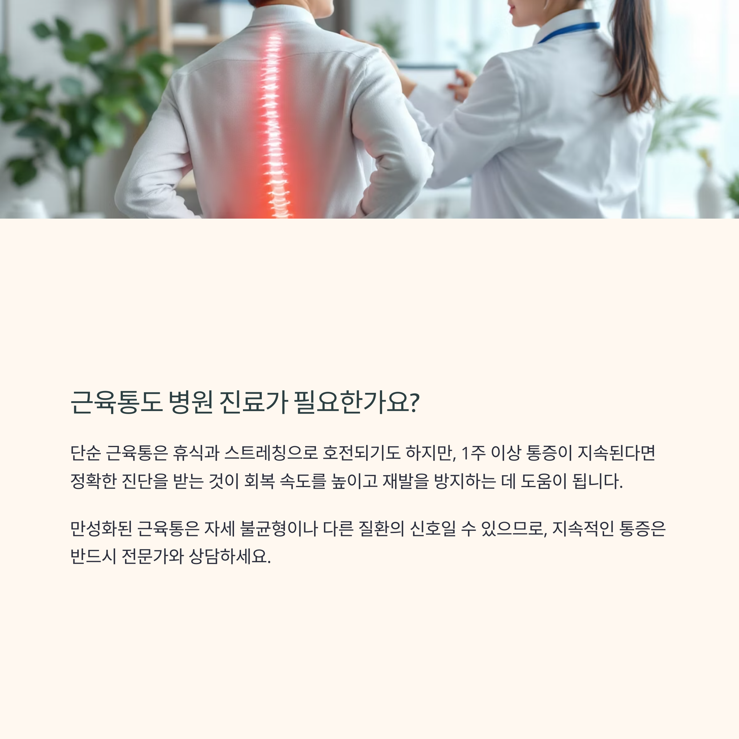 | 단순 근육통 특징 | 특정 자세에서만 통증, 휴식 시 증상 완화됩니다 |