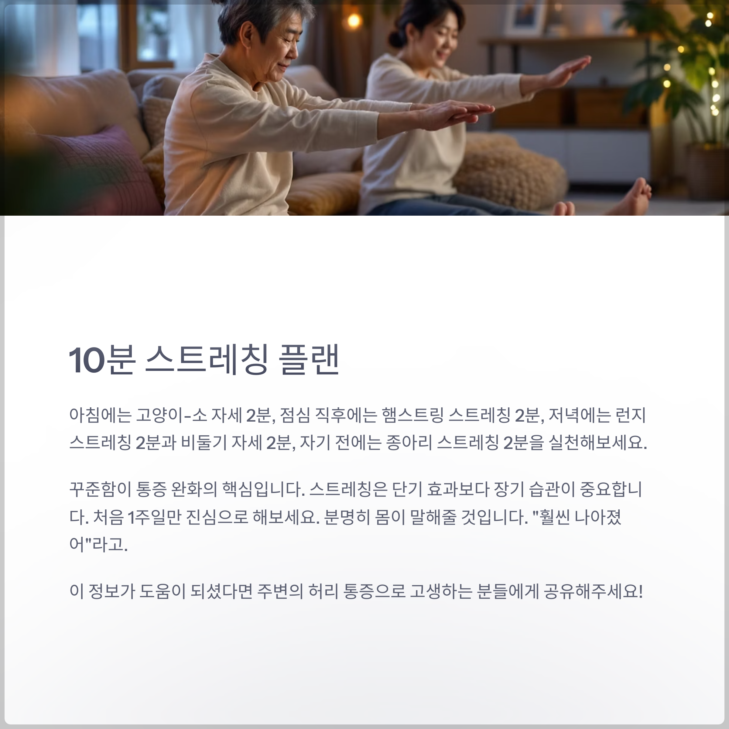 꾸준함이 통증 완화의 핵심입니다. 스트레칭은 단기 효과보다 장기 습관이 중요하다는 점, 잊지 마세요. 처음 1주일만 진심으로 해보세요. 분명히 몸이 말해줄 것입니다. "훨씬 나아졌어"라고.