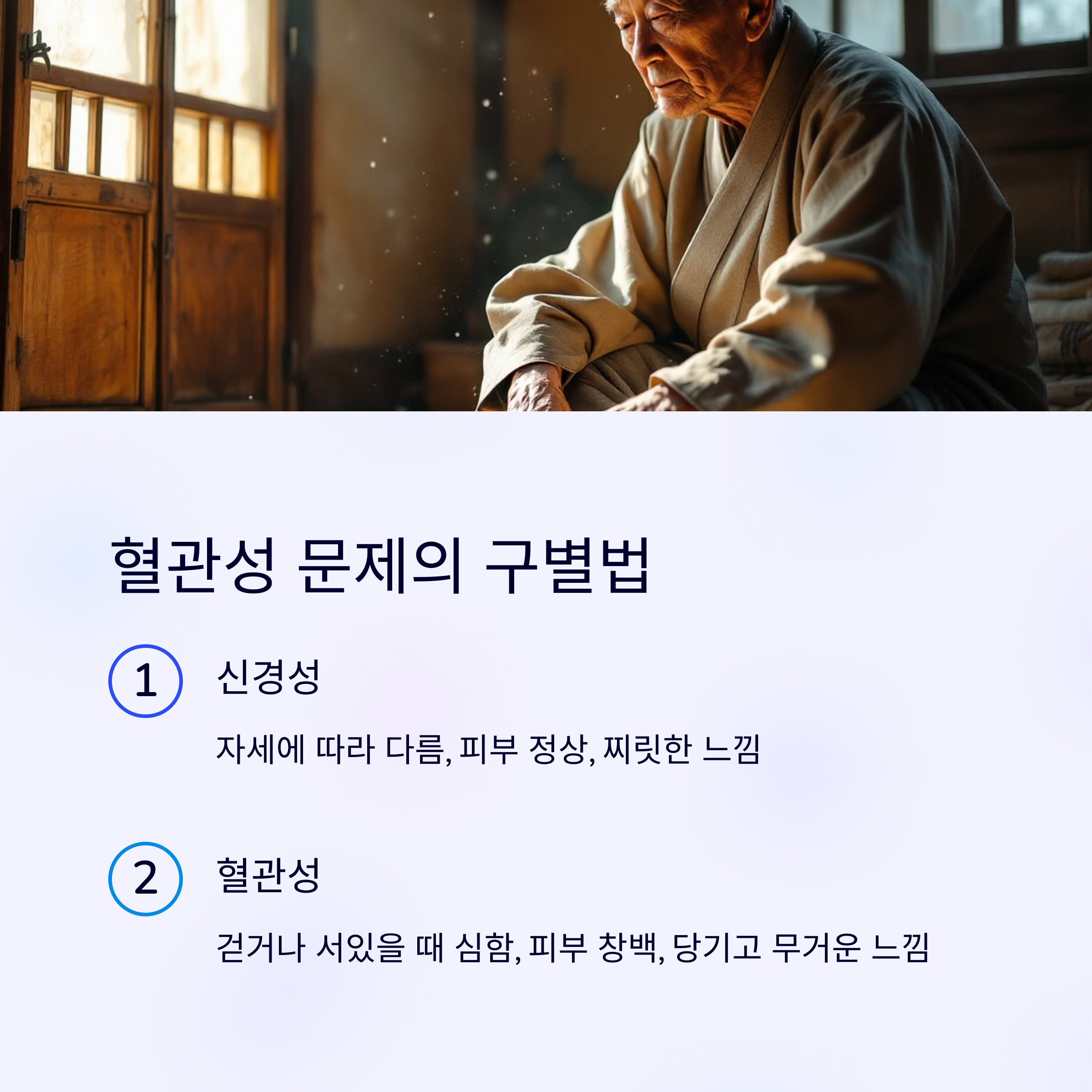 다리 저림이 모두 신경 문제는 아닙니다. 특히 고령층, 고혈압이나 당뇨를 앓고 있는 경우는 ‘하지허혈’과 같은 혈관성 질환일 수 있습니다. 이 경우 다리 전체가 차고, 피부색이 창백하며, 걷다가 쉬면 괜찮아지는 간헐적 파행이 대표 증상입니다.