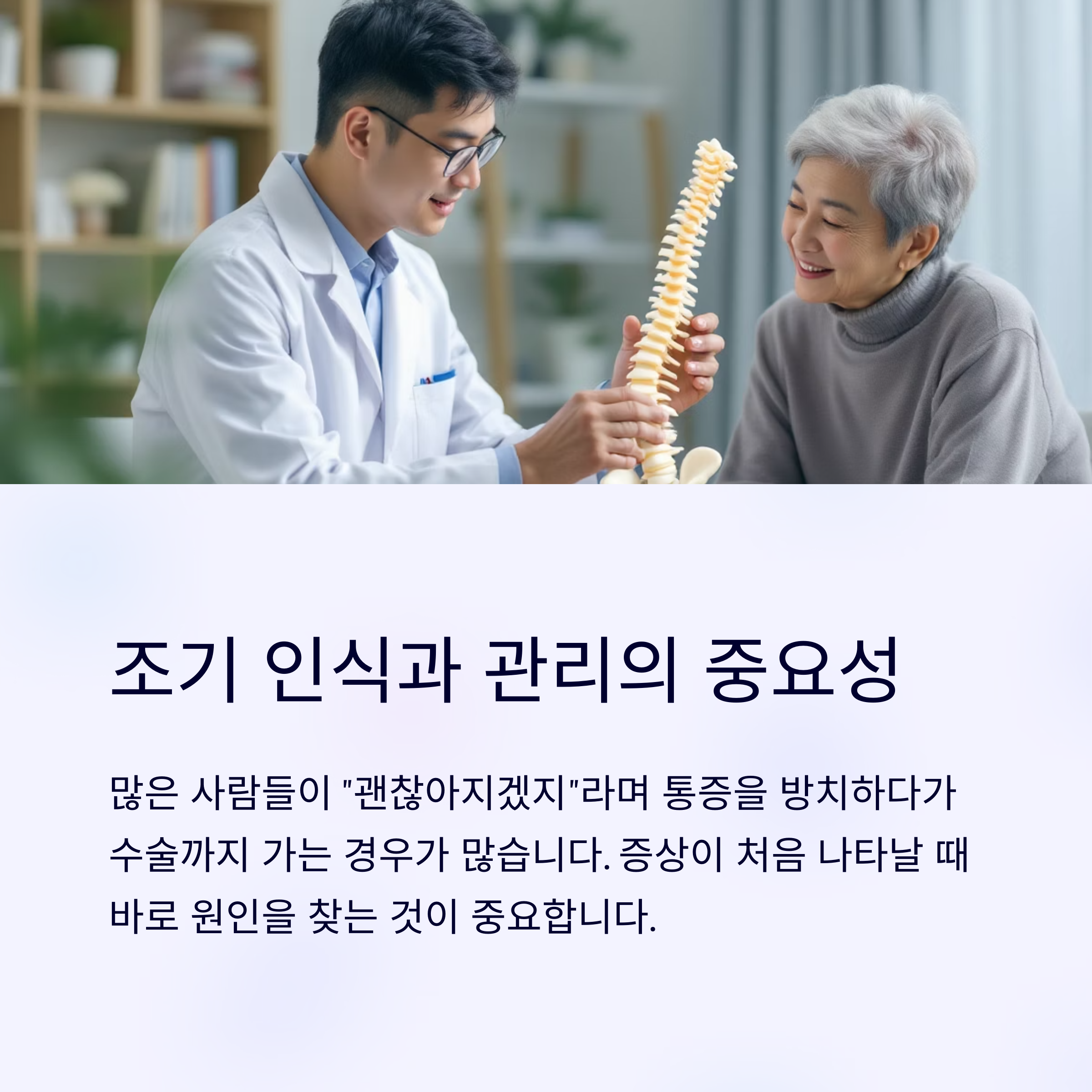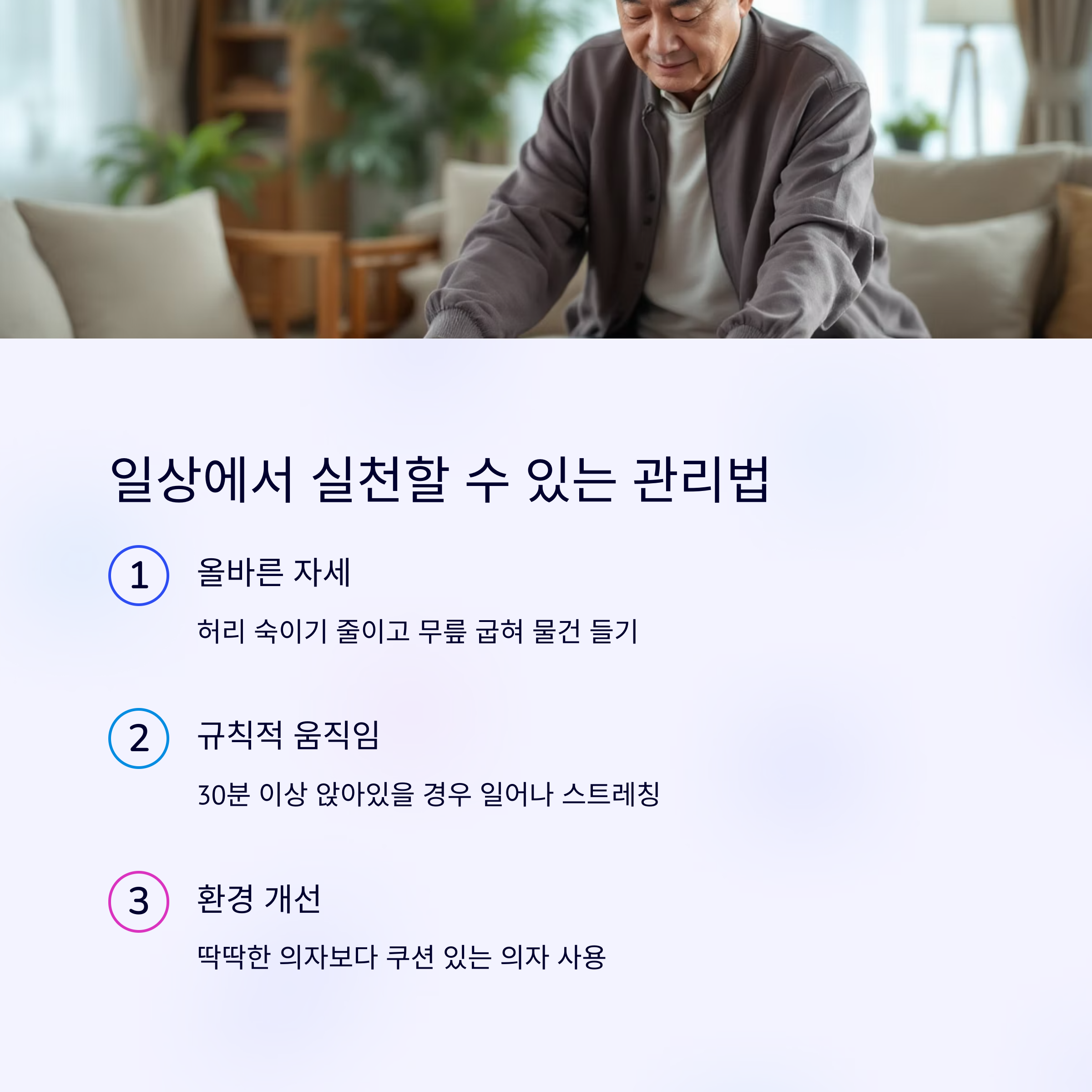 많은 사람들이 “괜찮아지겠지”라며 통증을 방치하다가 오히려 수술까지 가는 경우도 많습니다. 중요한 건 증상이 처음 나타날 때 바로 원인을 찾아내는 것입니다. 아래와 같은 일상 습관을 지금부터라도 바꾸는 것이 좋습니다.