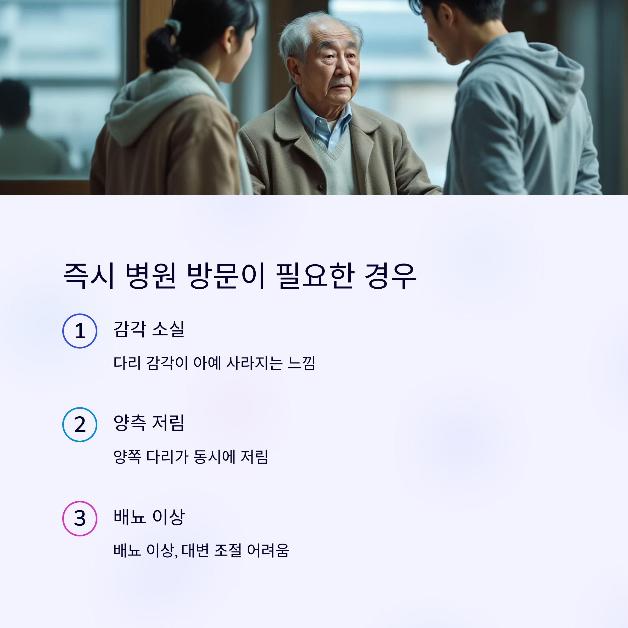 배뇨 이상, 대변 조절 어려움 | 긴급 수술 필요 가능성 있음 |