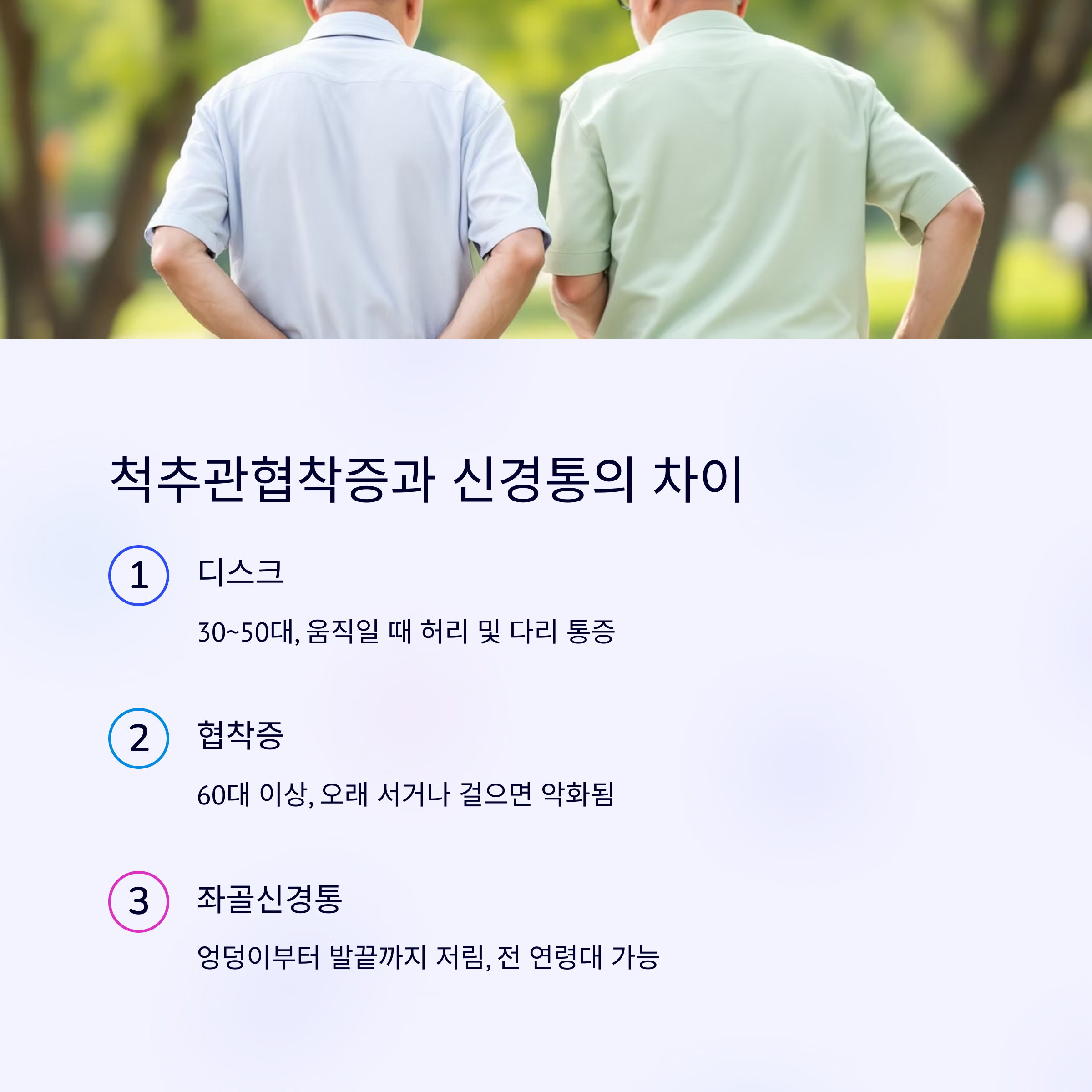 | 좌골신경통 | 엉덩이~발끝까지 저림 | 전 연령대 가능 |