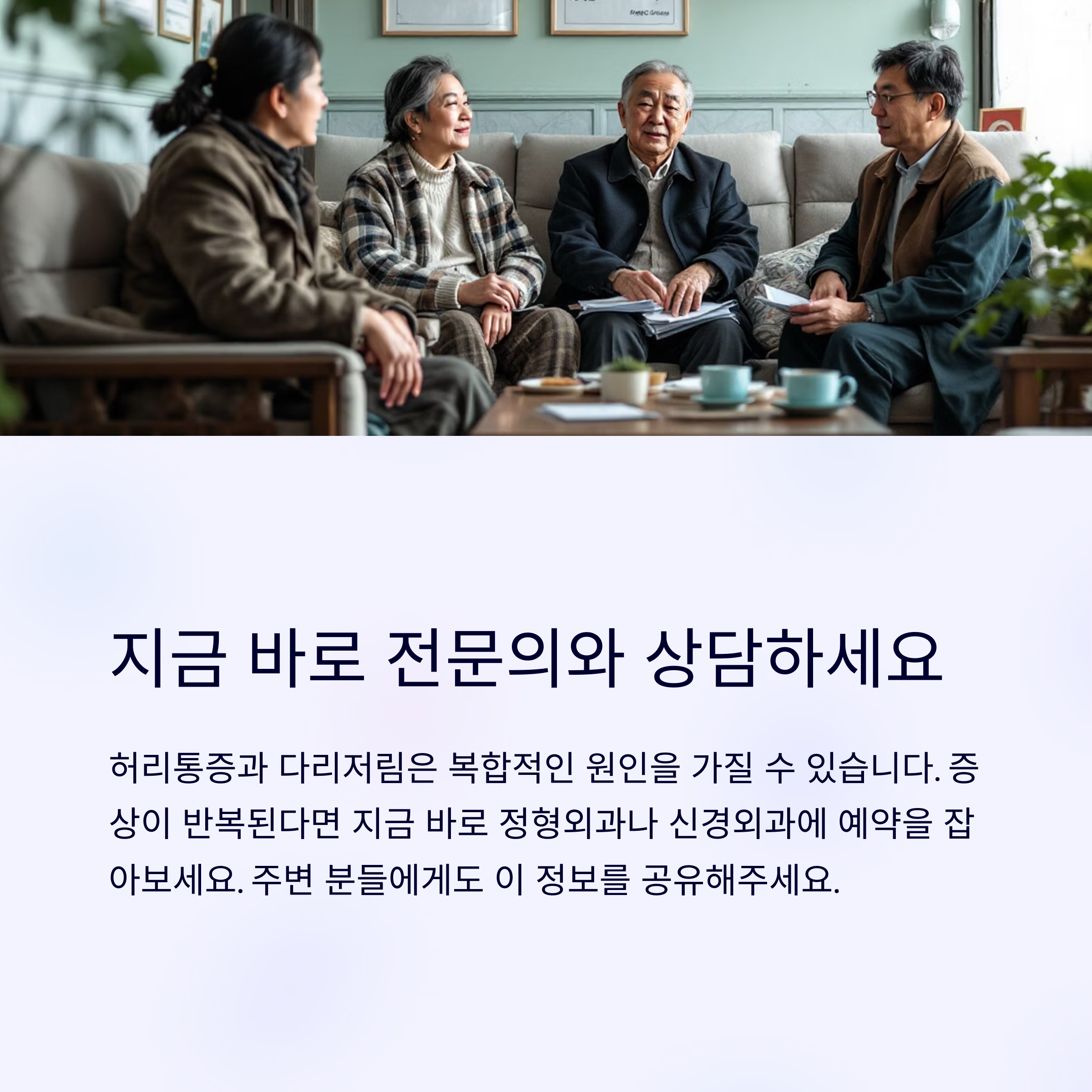 허리통증과 다리저림은 생각보다 복합적인 원인을 가질 수 있습니다. 단순한 근육통일 수도 있지만, 디스크, 협착증, 좌골신경통, 심지어 혈관 질환까지 다양한 가능성이 있기 때문에 자가 진단만으로 넘기면 절대 안 됩니다. 증상이 반복된다면 지금 바로 정형외과나 신경외과에 예약을 잡아보세요. 1분의 지체가 몇 개월의 통증을 줄일 수 있습니다.