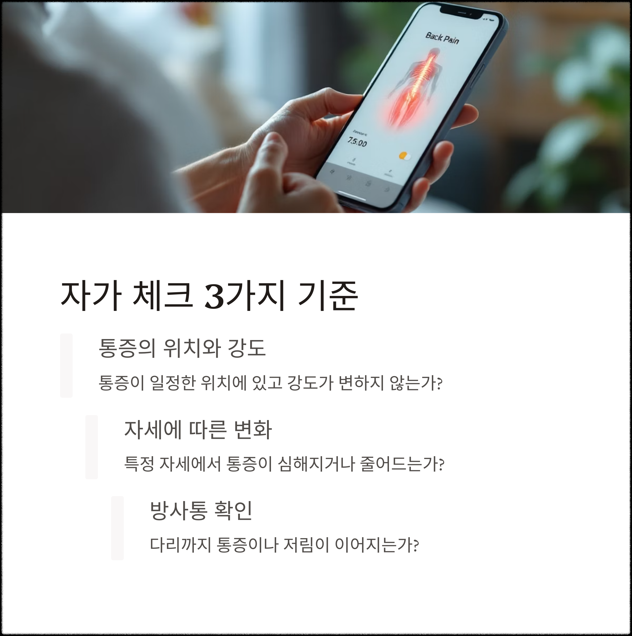 직접 겪은 허리통증을 기준으로 의료진에게 진단받기 전까지 내가 참고했던 기준은 다음과 같습니다.