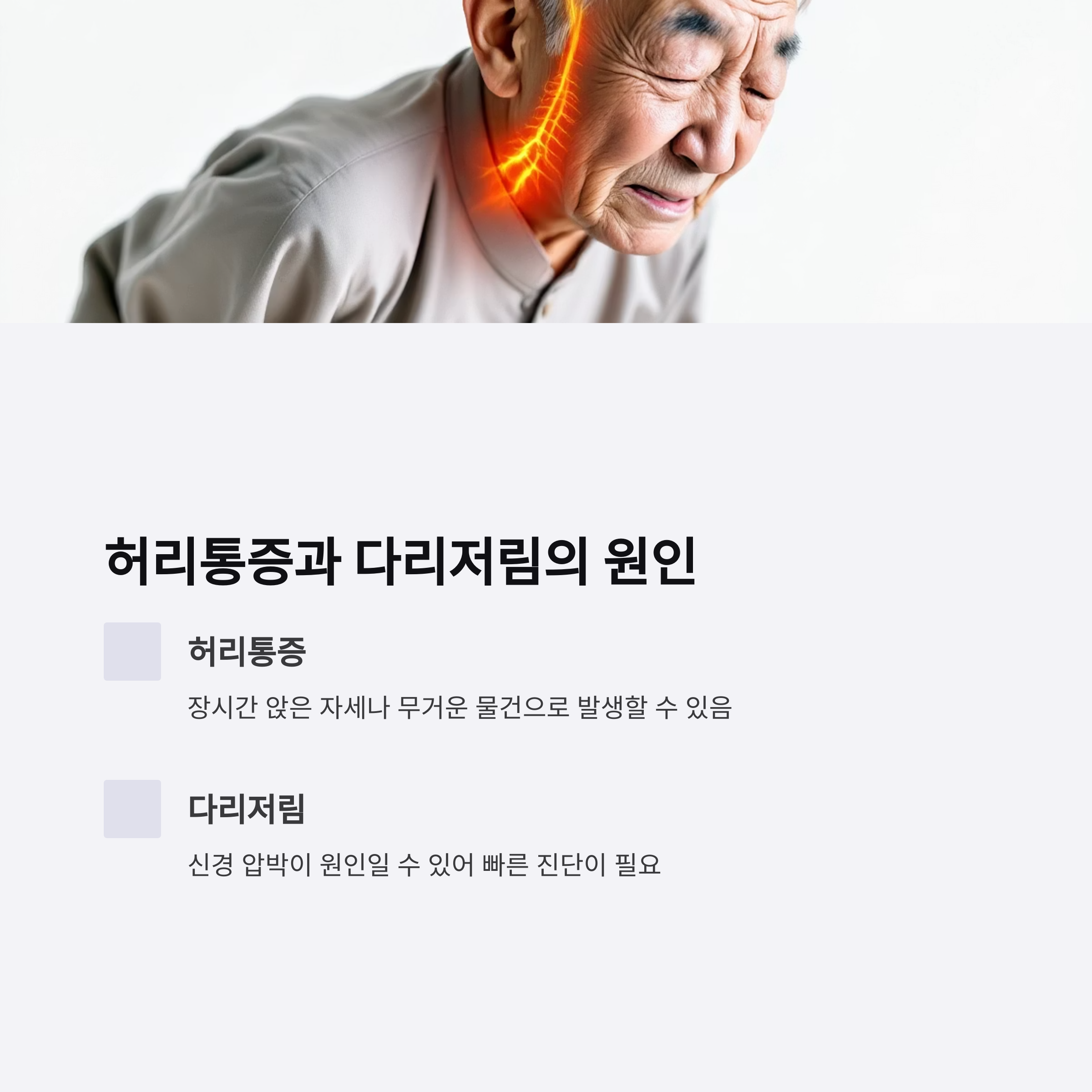 | 추간판 탈출증으로 인한 허리통증과 방사통 유발 | 신경 압박 시 통증 외에도 감각 이상 동반 가능 | 2주 이상 지속되는 통증은 병원 진료 필요 |