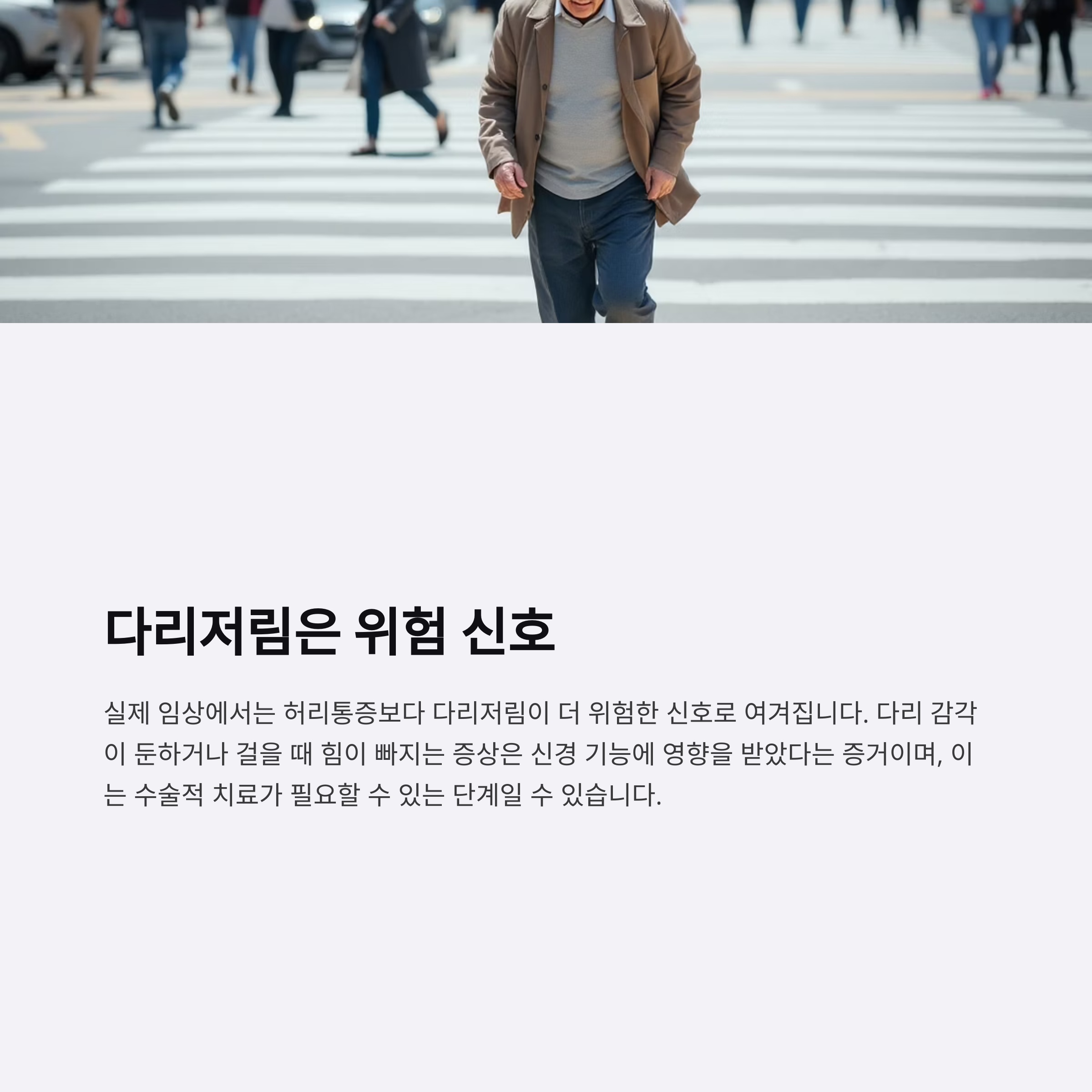 실제 임상에서는 허리통증보다 다리저림이 더 위험한 신호로 여겨집니다. 다리 감각이 둔하거나 걸을 때 힘이 빠지는 증상은 신경 기능에 영향을 받았다는 증거이며, 이는 수술적 치료가 필요할 수 있는 단계일 수 있습니다. 특히 대소변 기능까지 영향을 받는다면 응급 상황에 해당하므로 즉시 응급실로 이동해야 합니다. 통증이 있을 때마다 약이나 찜질로만 버티는 것은 문제를 더 악화시킬 수 있으며, 정형외과 또는 신경외과 전문의 상담을 통해 정확한 진단을 받는 것이 무엇보다 중요합니다.