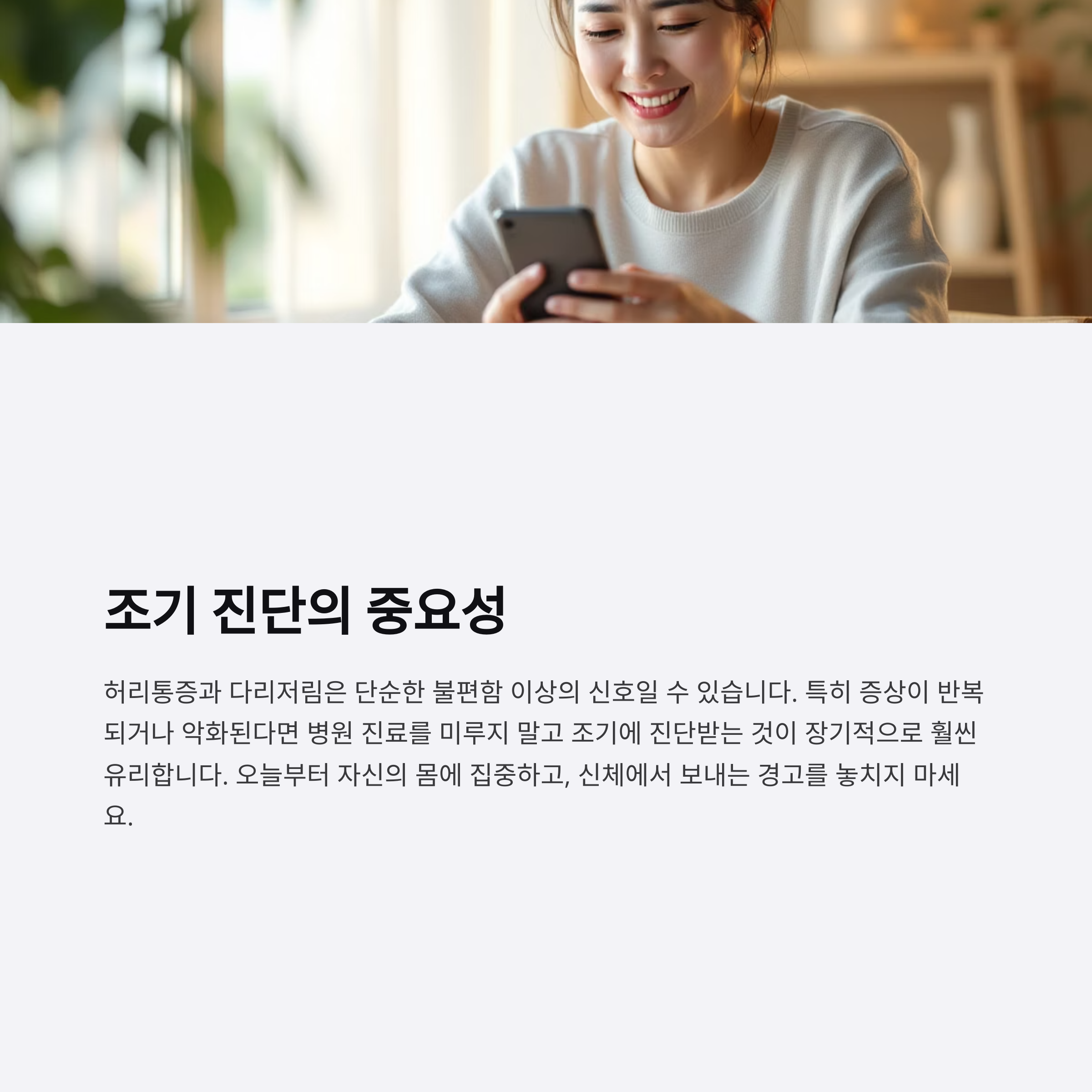 허리통증과 다리저림은 단순한 불편함 이상의 신호일 수 있습니다. 특히 증상이 반복되거나 악화된다면 병원 진료를 미루지 말고 조기에 진단받는 것이 장기적으로 훨씬 유리합니다. 오늘부터 자신의 몸에 집중하고, 신체에서 보내는 경고를 놓치지 마세요. 지금 바로 근처 정형외과 또는 신경외과를 검색하고 진료 예약을 해보세요. 행동하는 것이 가장 빠른 치료의 시작입니다.