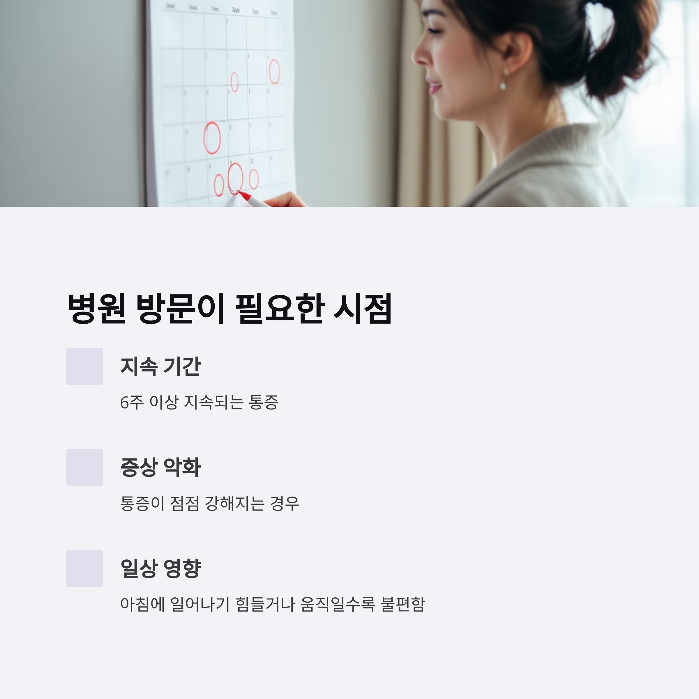 조기 진단과 치료는 허리 통증의 예후를 결정짓는 가장 큰 요소입니다. 병원에 가야 할 때를 놓치지 않기 위해서는 통증의 양상과 지속 기간, 일상생활에 미치는 영향을 객관적으로 기록해두는 것이 좋습니다. 주저하지 말고 지금 바로 전문 병원을 검색해 가까운 곳에 예약을 넣어보세요. 또한 자세 교정과 운동, 체중 관리 등도 함께 병행해야 재발을 방지할 수 있습니다.