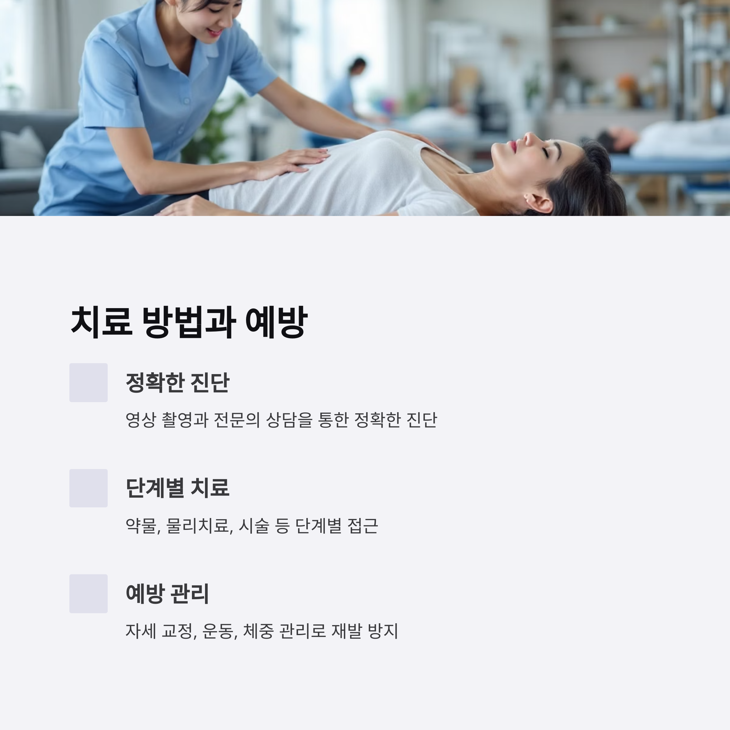 | 정확한 영상 촬영과 진단 통해 치료 방향 설정 | 약물, 물리치료, 시술 등 단계별 접근 중요 | 늦지 않게 치료 받는 것이 장기 예후에 유리 |