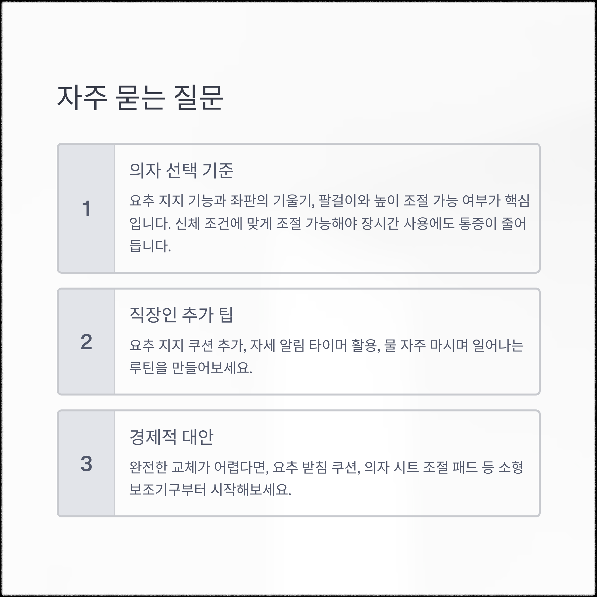 잘못된 자세로 인해 생긴 허리통증과 다리저림은 시간이 지나면 더 악화될 수 있습니다. 하지만 몸에 맞는 의자를 선택하고, 앉는 자세를 바르게 잡는 것만으로도 생활 속 통증은 놀랄 만큼 줄어들 수 있습니다. 오늘부터 의자를 점검하고, 작은 자세 변화부터 실천해보세요. 누구나 할 수 있는 간단한 변화지만 그 효과는 분명합니다. 지금 바로 확인하고, 몸이 편안해지는 경험을 직접 느껴보세요. 행동은 늦을수록 회복도 늦어진다는 점, 기억해주세요.