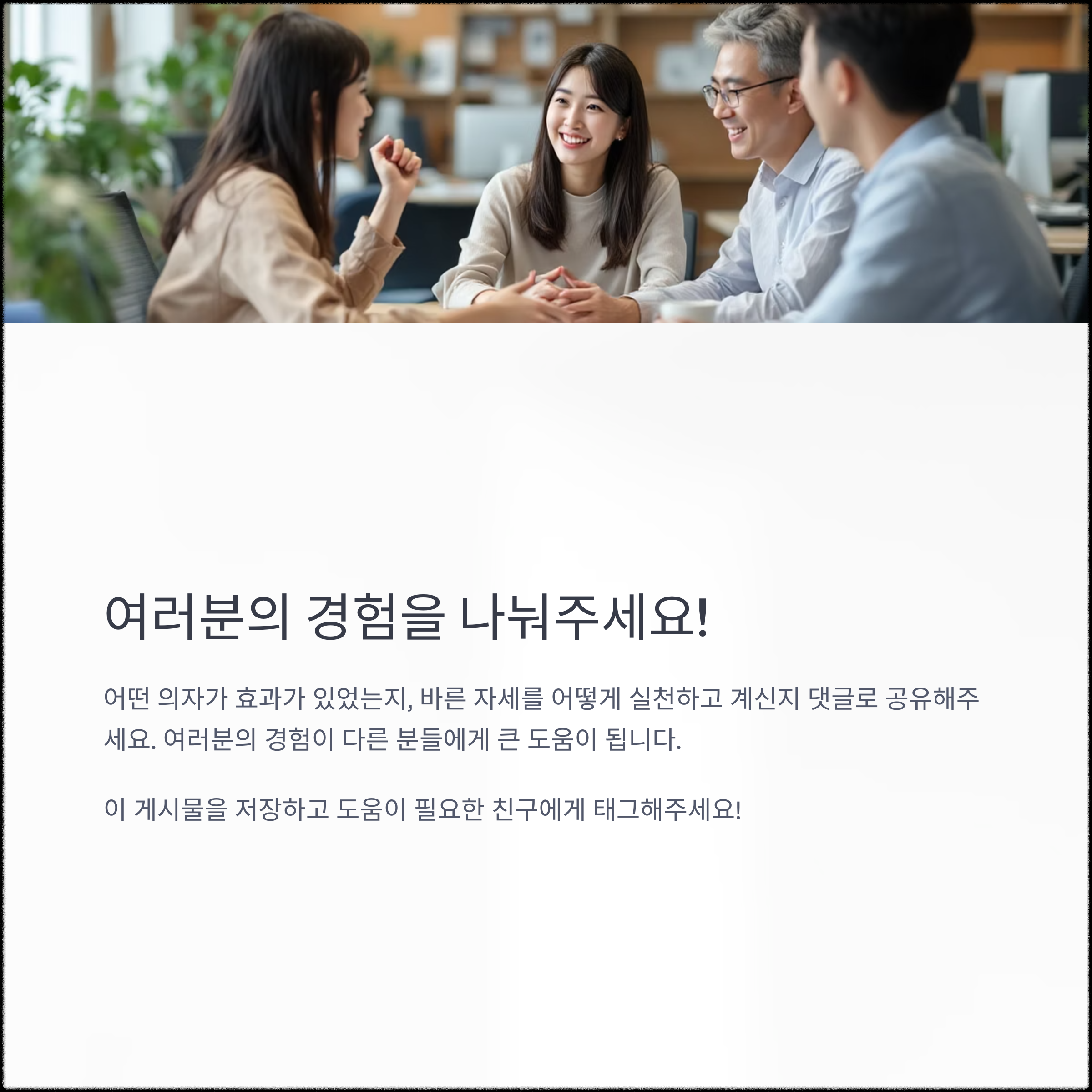 어떤 의자가 효과가 있었는지, 바른 자세를 어떻게 실천하고 계신지 댓글로 나누어 주세요. 여러분의 경험이 또 다른 독자에게 큰 도움이 됩니다. 좋은 습관은 공유할수록 더 건강해집니다.