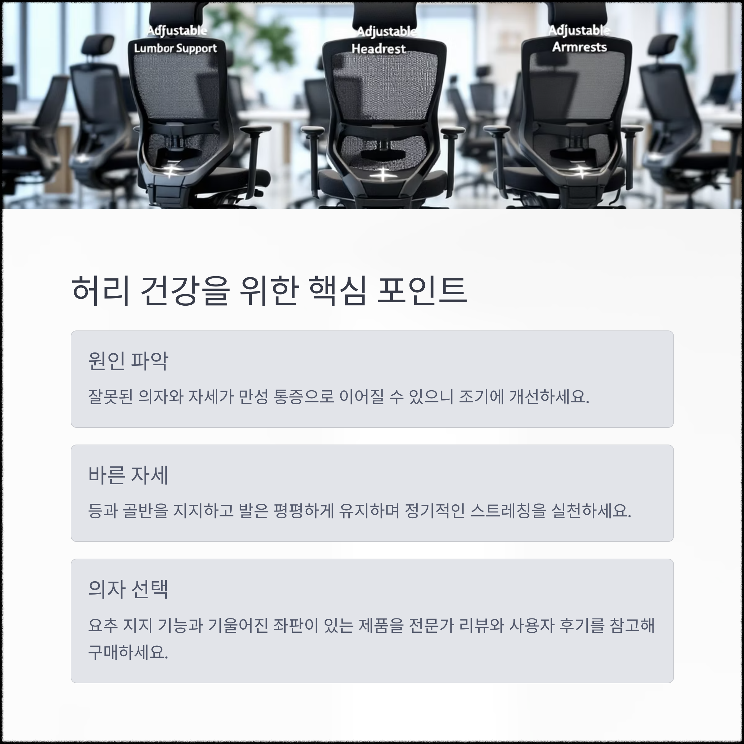 잘못된 의자 사용과 자세가 주요 원인입니다 | 등과 골반을 지지하고, 발은 평평하게 유지하세요 | 요추 지지 기능과 기울어진 좌판이 있는 제품이 좋습니다 |