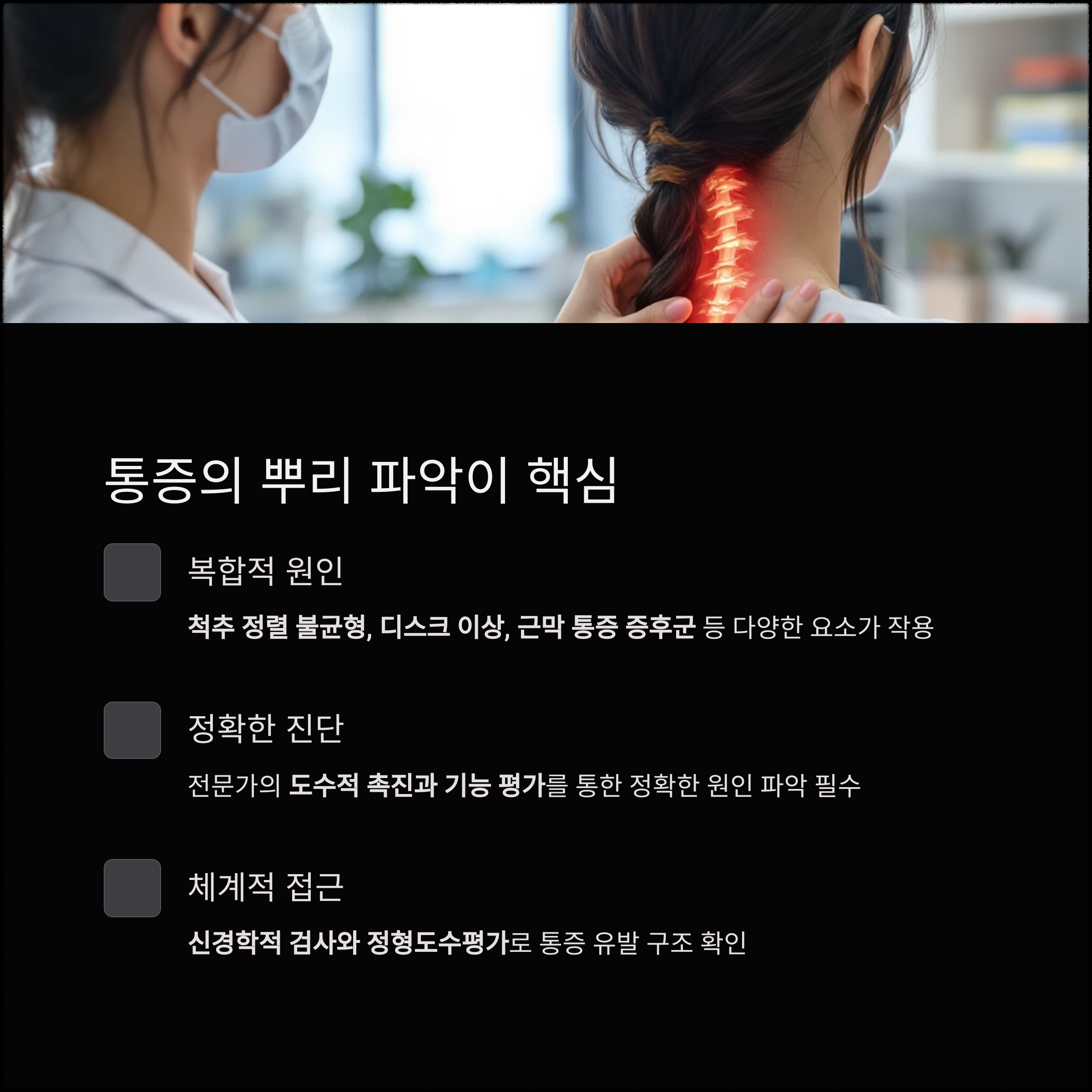 척추 정렬의 불균형, 디스크 이상, 근막 통증 증후군 등 다양한 원인이 복합적으로 작용합니다.