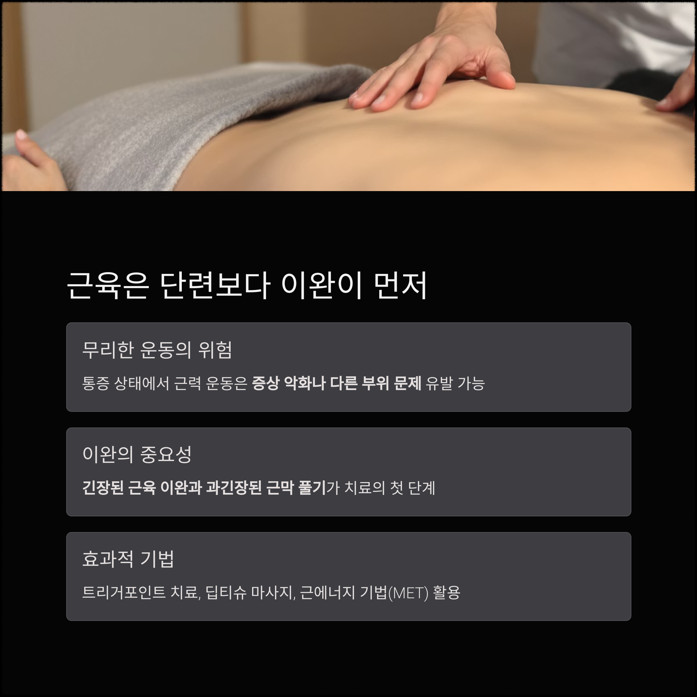먼저 긴장된 근육을 이완하고, 과긴장된 근막을 풀어주는 것이 중요합니다.